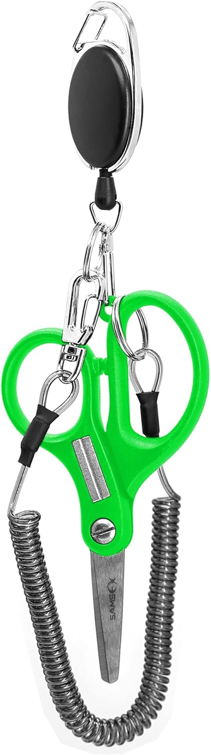 SAMSFX FISHING MAKING YOUR FISHING SIMPLE & EFFICIENT For fishing enthusiasts, fishing braided line scissor cutter is a necessary accessory Cuts through the tough braided line like butter An essential tool for every fisherman Good gifts for every Anglers Pay Attention: Please allow 0.4-0.8 " (1-2 cm) differences due to manual measurement Due to the difference between different monitors, the picture may ot reflect the actual color of the item Features: Serrated edges for easy non-slip cutting braid and mono fishing line Fishing braid scissors are one the absolute essentials to have in your tackle box Musthave tool for setting up, changing rigs and dealing with the occasional line tangle or snag Blunt tip and serrated edges provide comfort safety and functionality on the water Retractors or tough connecting magnet (optional)can quickly release and connect the scissors to ensure the cord free handle How to use scissors with magnet Carabiner clip to connect to fly vest, backpack or wader belts Tough connecting magnets holds both ends together when stored It will break free when pulled allowing cord free handling of attached device Heavy duty and stainless steel split ring is great for tool attachment Note If you fish in saltwater, we recommend you applying a lubricant and allowing the scissors ample time to dry after each use