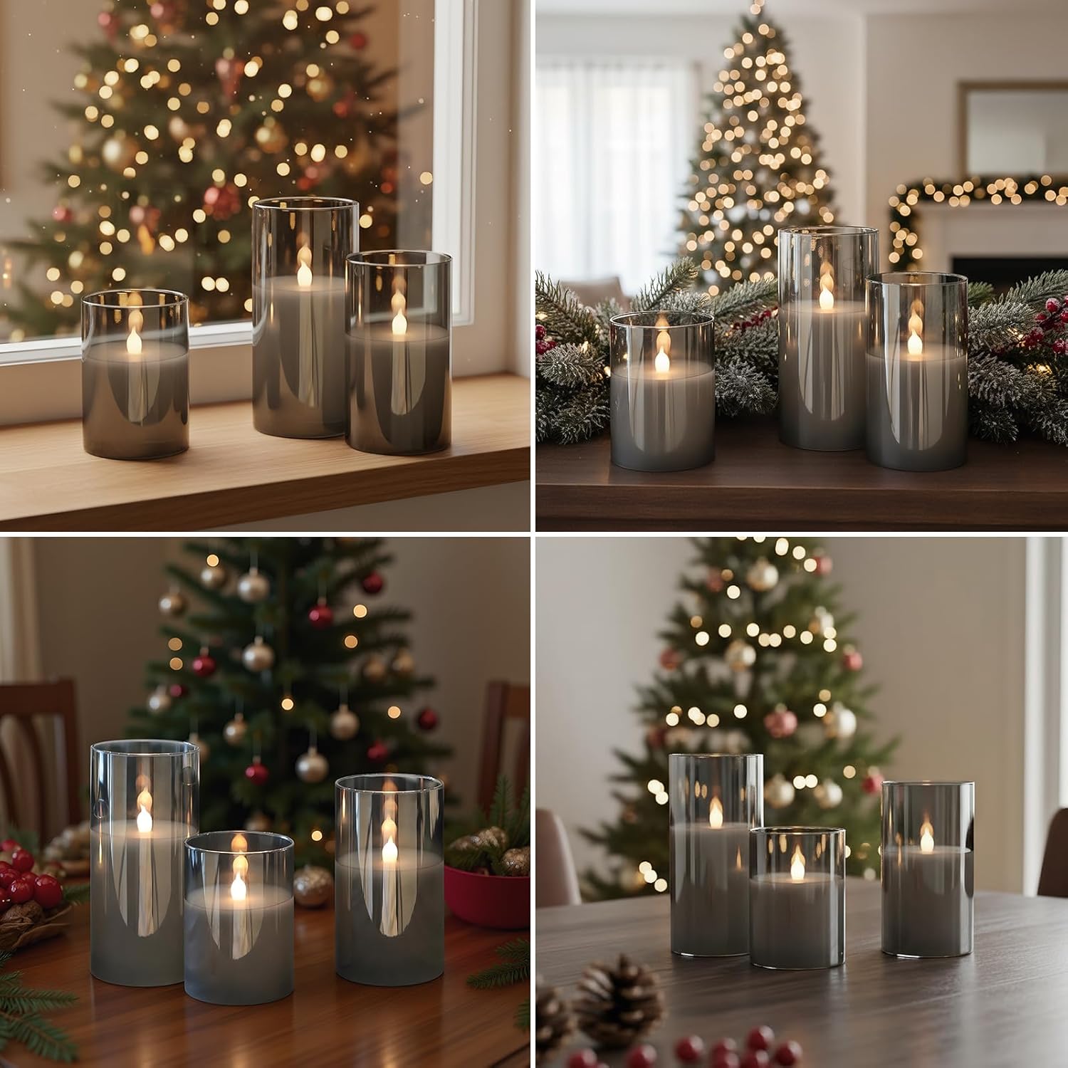 GenSwin Velas LED sin llama de cristal gris de batería con control remoto de 10 teclas y temporizador, velas de cera reales con luz parpadeante blanca cálida para decoración del hogar (Set de 3)