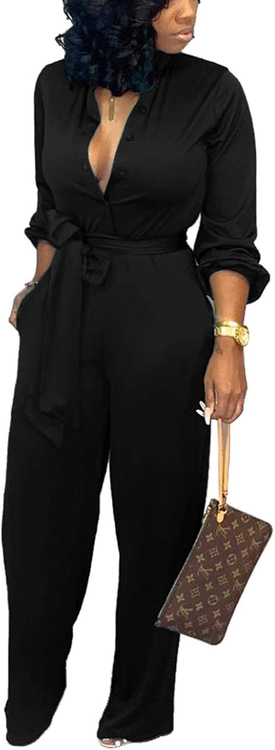 SxClub Jumpsuits for Women Formal Sexy Elegant Long Straight Pants Busineess Party Jumpsuit with Belt Pockets