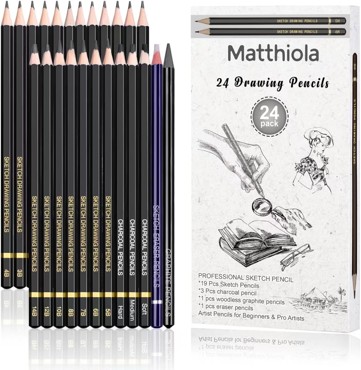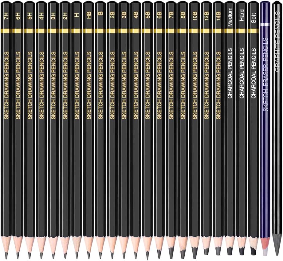 Conjunto de lápices de dibujo - 24 Piezas Lápiz de Dibujo Sketch HB,B,2B,3B,4B,5B,6B,7B,8B,10B,12B,14B,H,2H,3H,4H,5H,6H,7H, Incluye lápices de carbón, borrador, lápices de grafito para principiantes y artistas profesionales