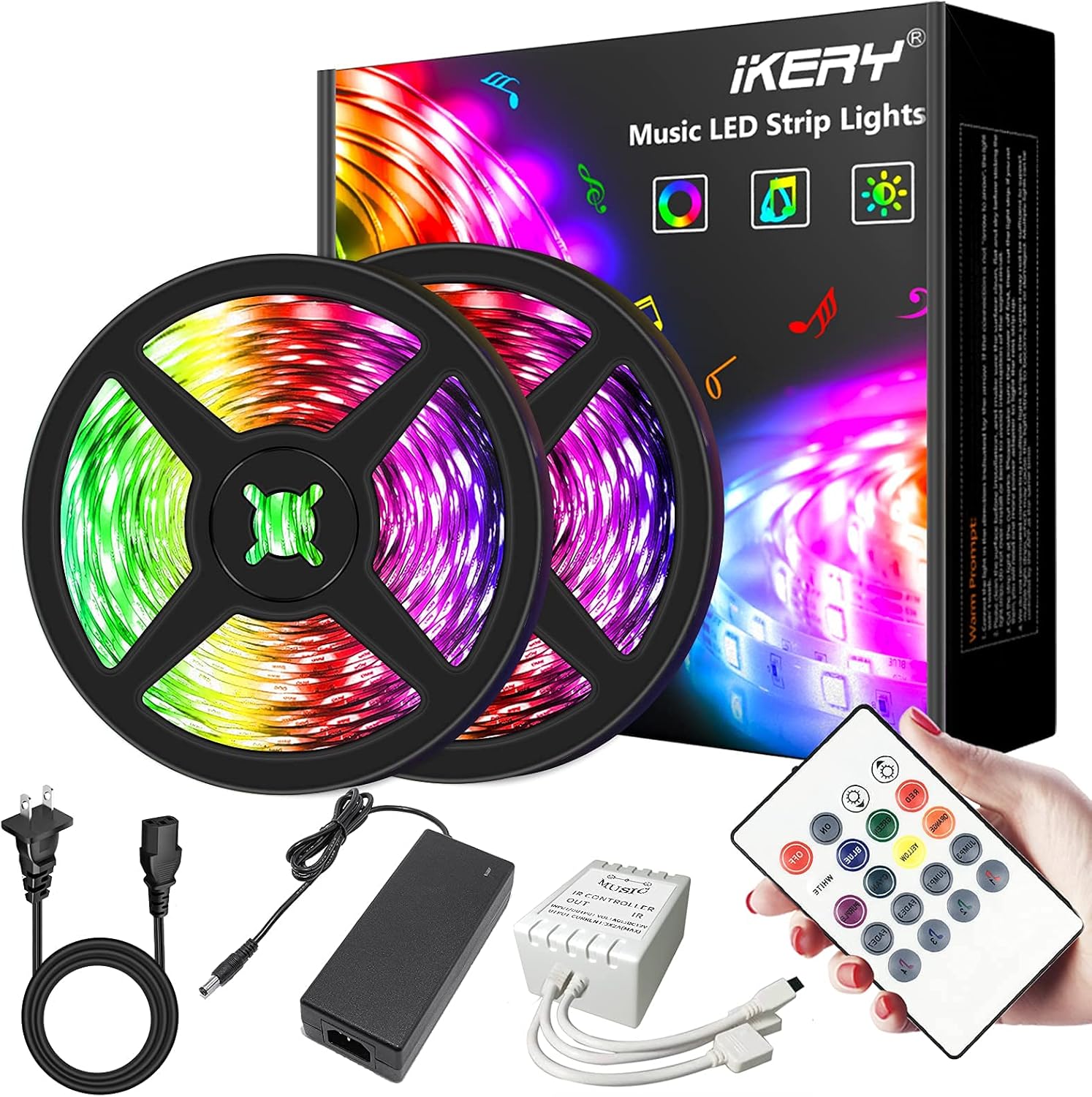 IKERY LED Strip Lights Music Sync, IP65 Waterproof Color Changing RGB Light Strips with 20keys Remote Controller and 12V Power Supply, 16.4ft SMD 5050 Tape Lights for Room, Bedroom, TV, Party