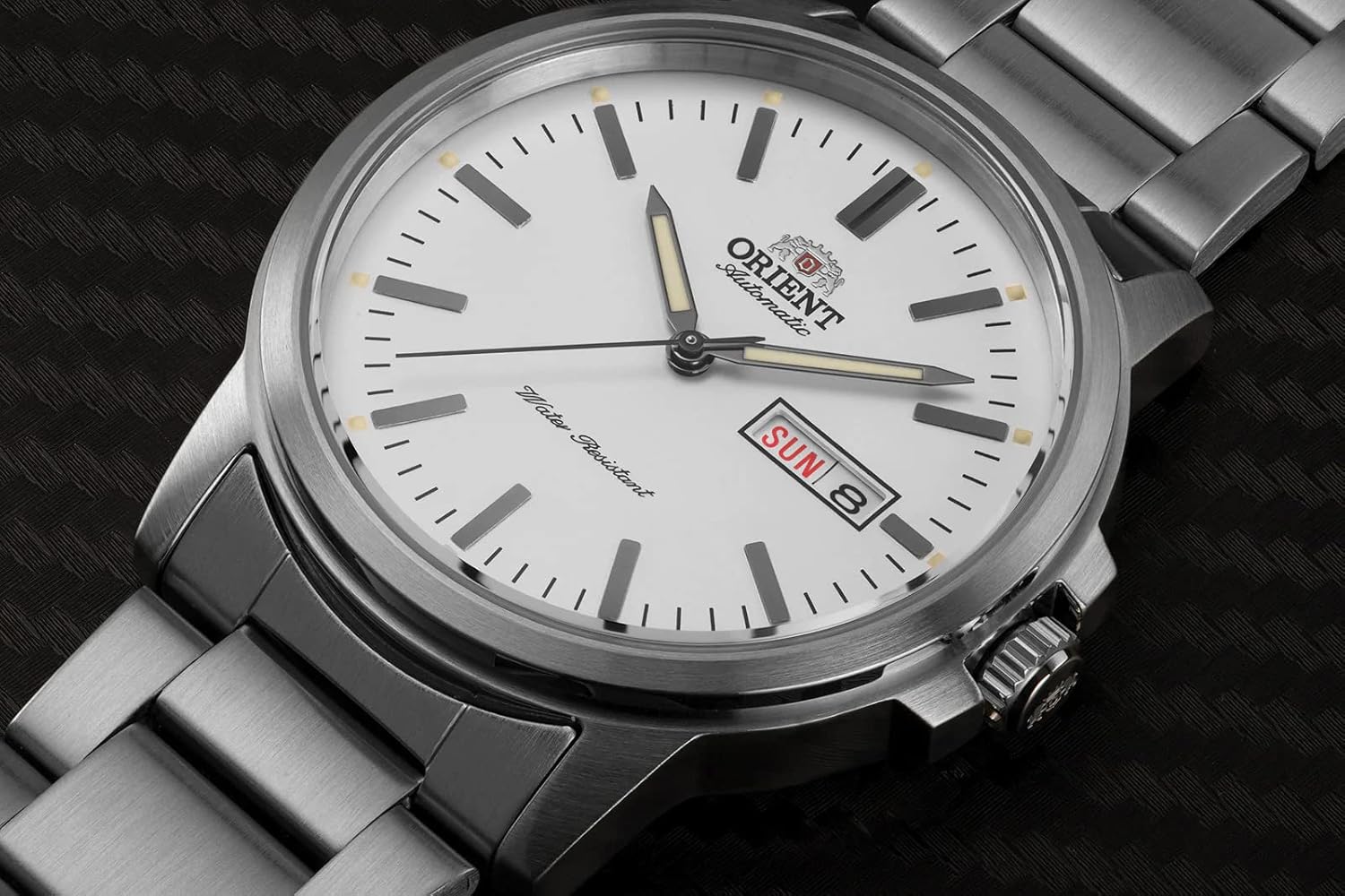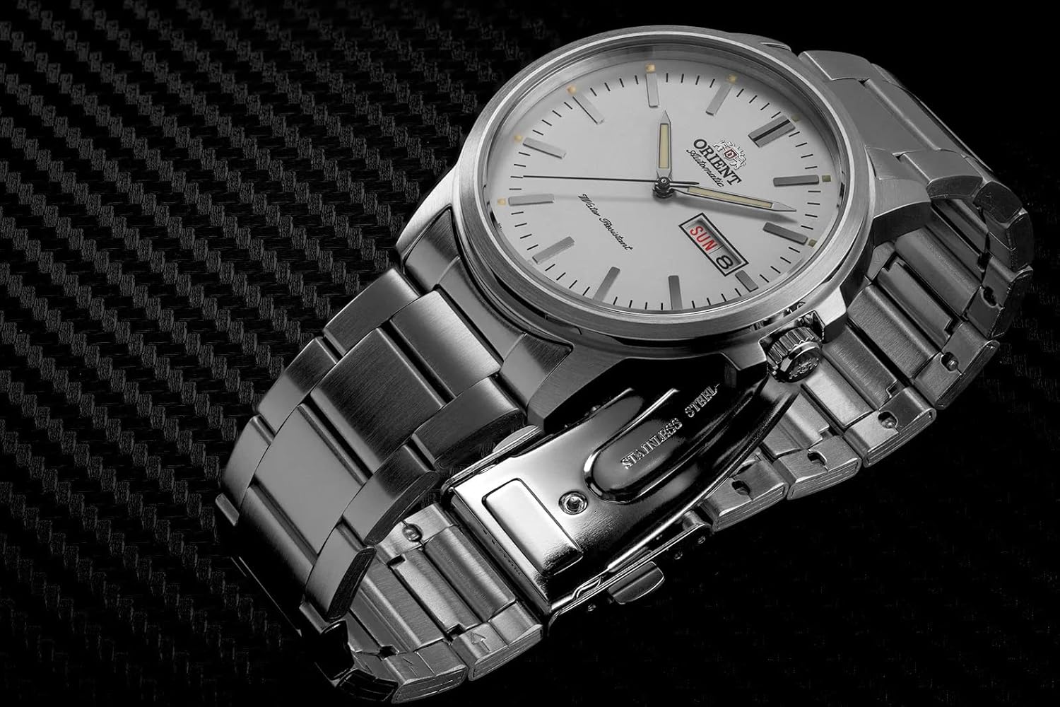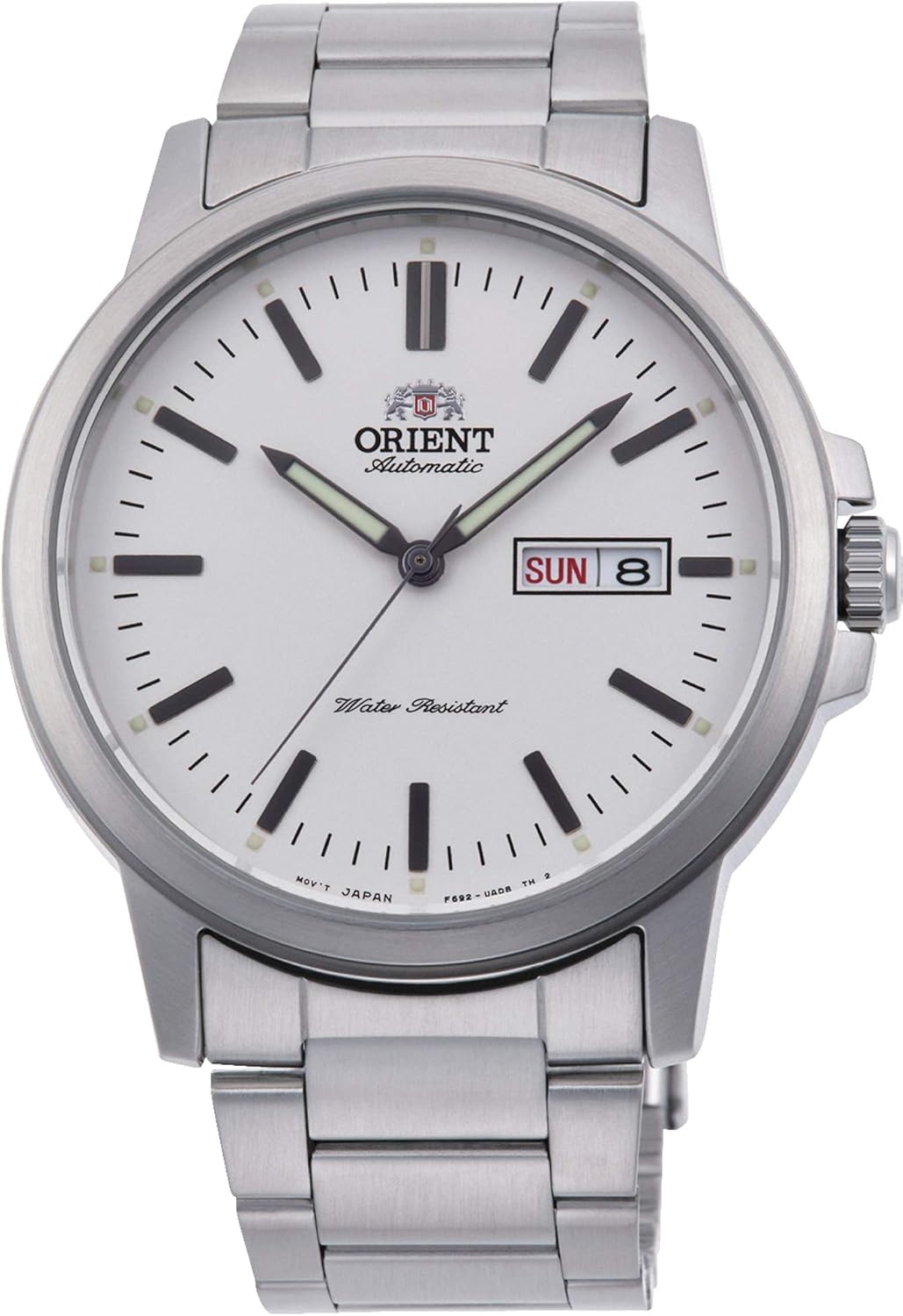 Esfera blanca realzada por manecillas luminosas plateadas estilo lápiz. Caja de acero inoxidable plateada con correa de acero inoxidable plateada. Movimiento automático. Resistencia al agua de 50 m/165 pies. Bisel fijo. Cristal mineral resistente a los arañazos. Fondo de caja transparente. Despliegue con cierre de botón pulsador. Corona de tracción/empuje. Tamaño de la caja 42 mm x 12 mm. Correa de 21 mm x largo. Reloj contemporáneo Orient RA-AA0C03S19B.