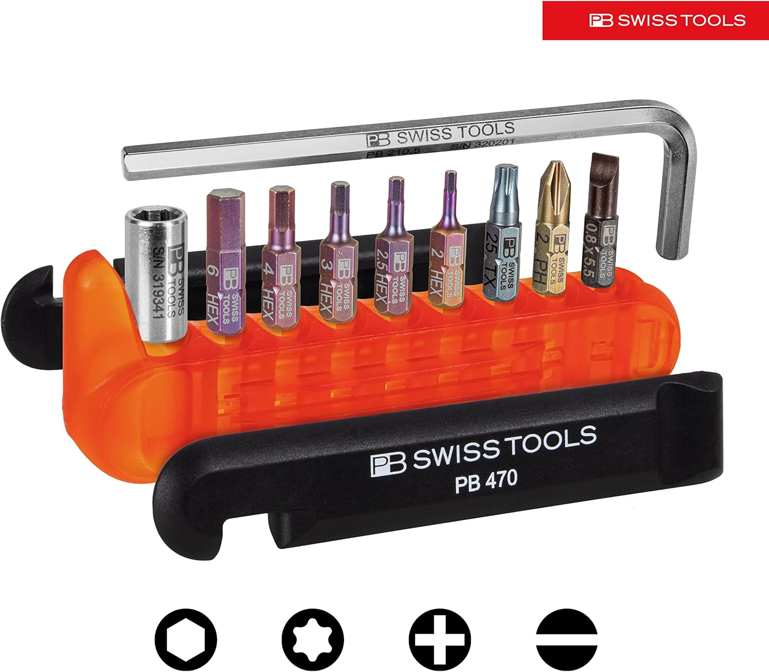 PB Swiss Tools Bike Multitool PB 470 | 100% Swiss Made | Pocket Tool with Bits, Allen Key, Steel Adapter, Tire Lever for Mountain and Road Bike, Bicycle, E-Bike