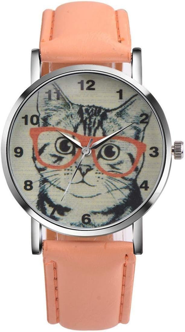 Unisex Scholar Cat Pattern Leather Band Analog Quartz Dial Wrist Watch (Blue)