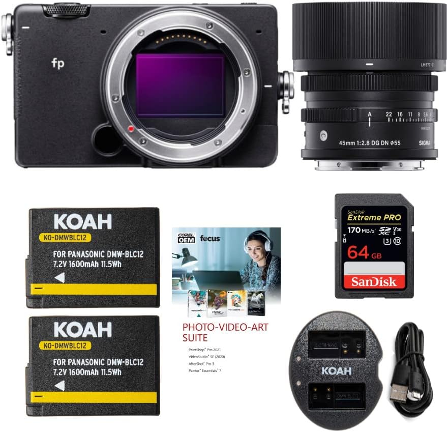 Bundle Includes: Sigma fp Mirrorless Full-Frame Digital Camera and 45mm f/2.8 Lens Kit, Photo Video Art Suite for Focus Camera v5 (OEM Download Card), PRO Panasonic DMW-BLC12 Two-Pack 1600mAh Battery and Dual Charger Set, and 64GB Extreme PRO 200 MB/s UHS-I SDXC Memory Card