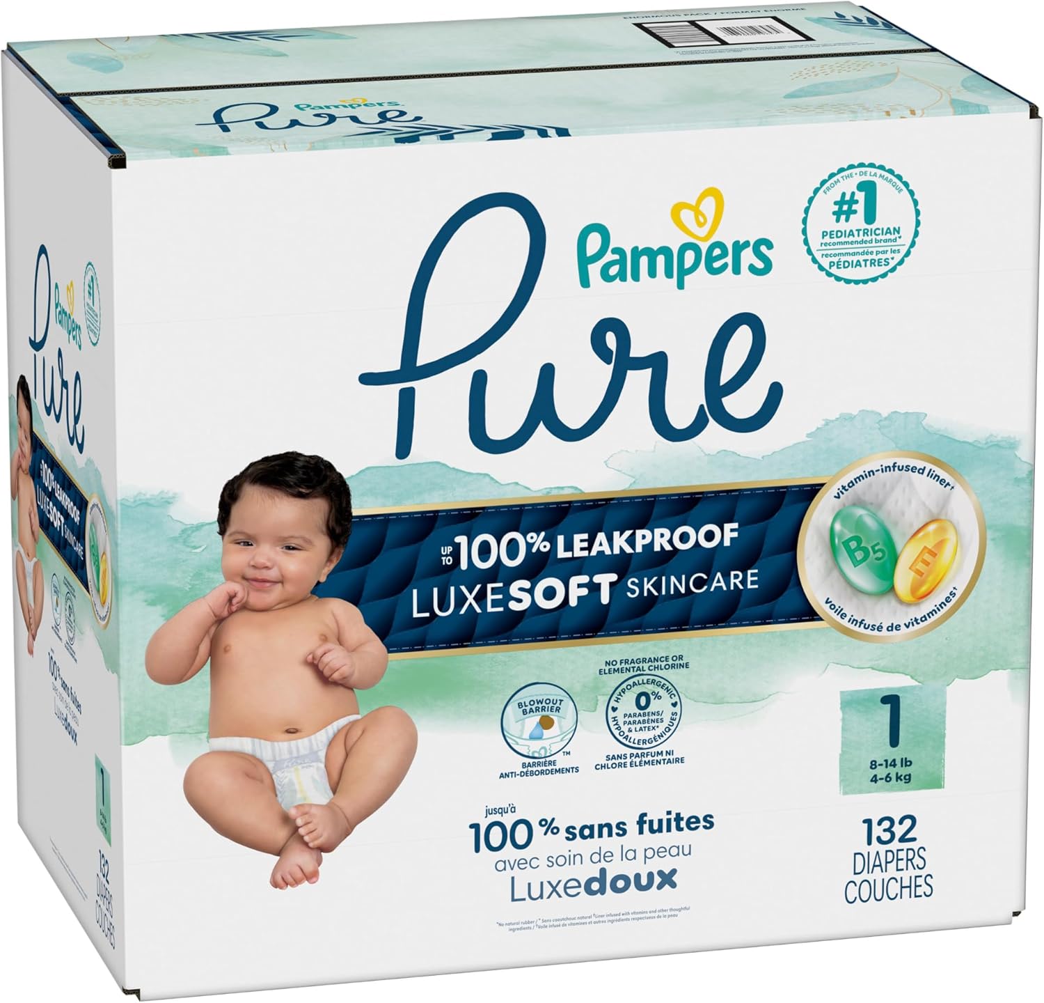 Pampers Pure Protection Baby Diapers, Size 1 (8-14 lbs), 132 Count, Up to 100% Leakproof, Premium Plant-based Skin Protection, Hypoallergenic Soft Diapers