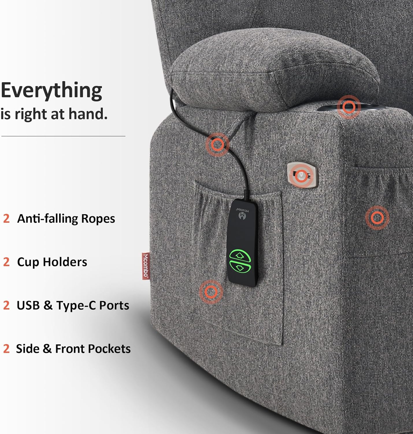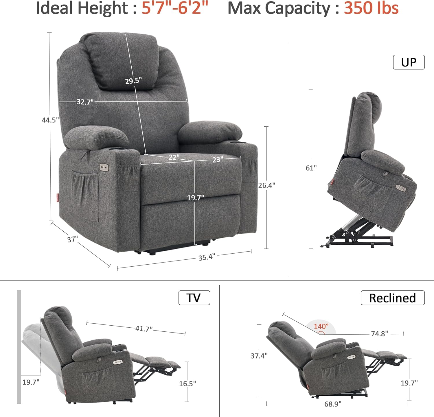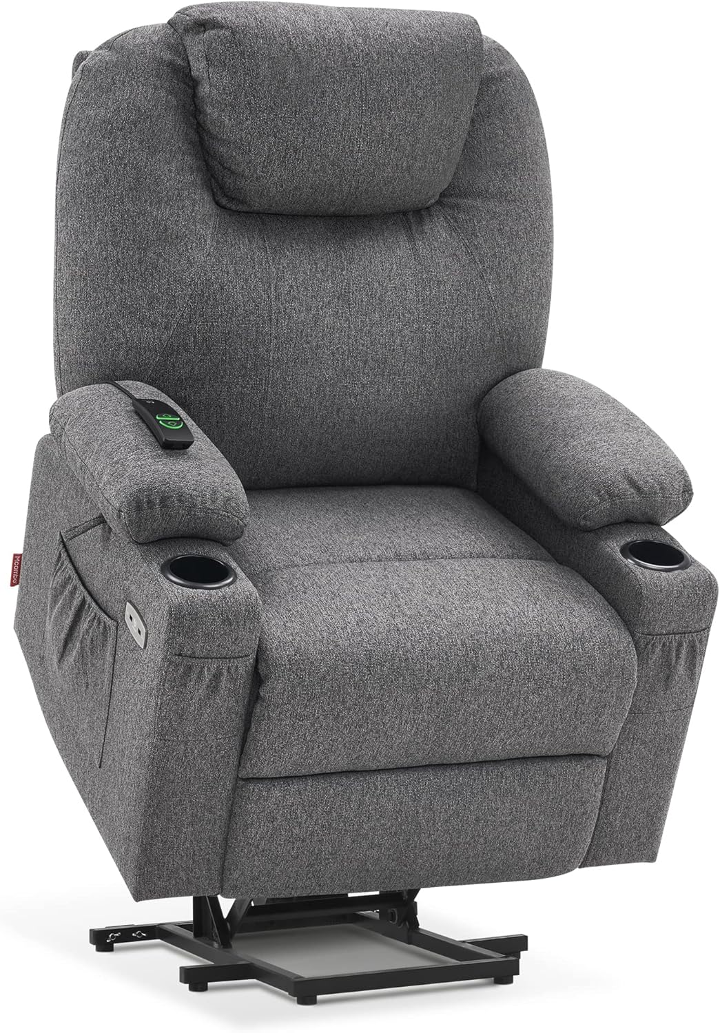 MCombo Power Lift Recliner Chair for Elderly, Lift Chair with Heat and Massage for Tall People, USB&Type C Ports, Extended Footrest, Cup Holders, Fabric 7516 (Large,Dark Grey)
