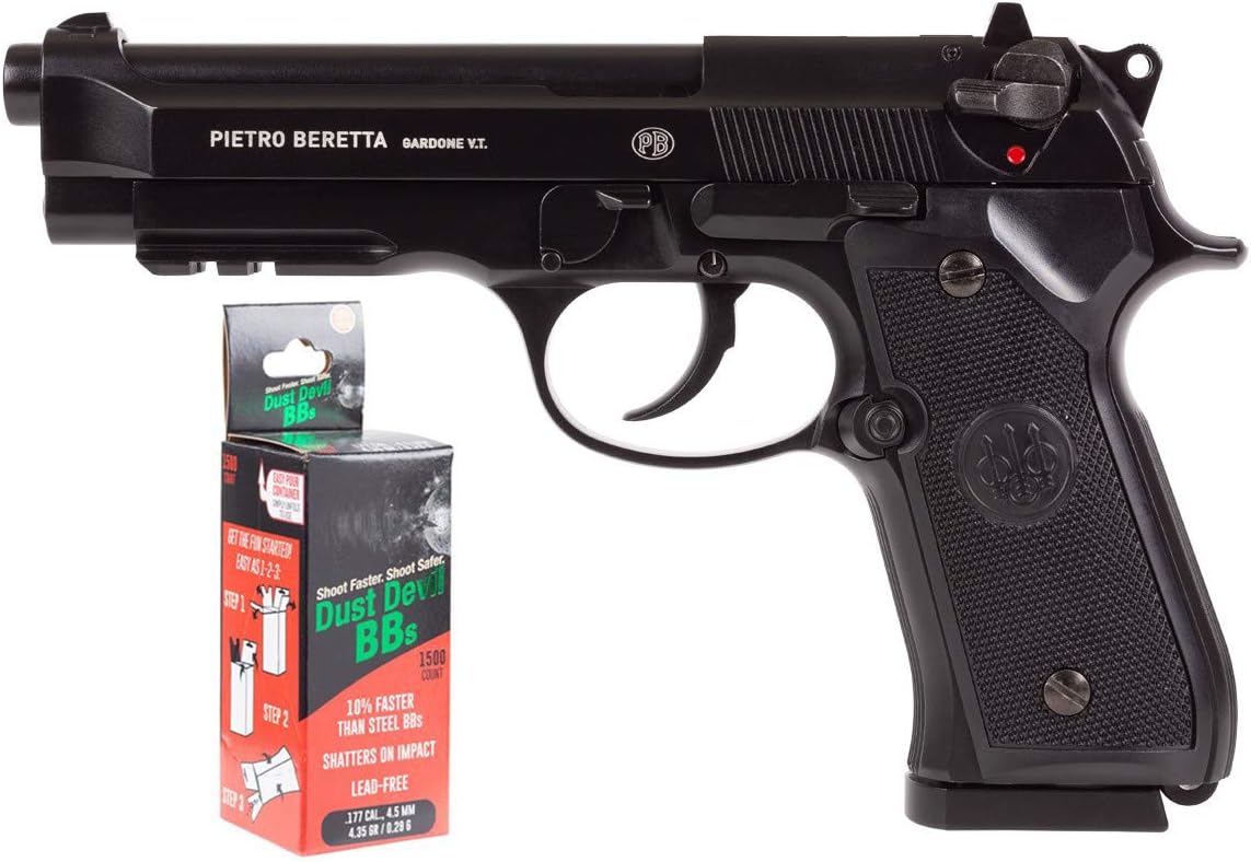 Beretta 92A1 pistol Kit Full-/semi-auto Utiliza un cartucho de CO2 de 12 gramos, cargador de BB sin caída de 18 cartuchos, marco y cargador de metal, miras tácticas fijas delanteras y traseras, doble/acción simple, seguridad manual, marco de metal completo, riel Weaver bajo el cañón para láser o linterna, incluye 1,500 BB's Dust Devil... Réplica de la venerada arma...