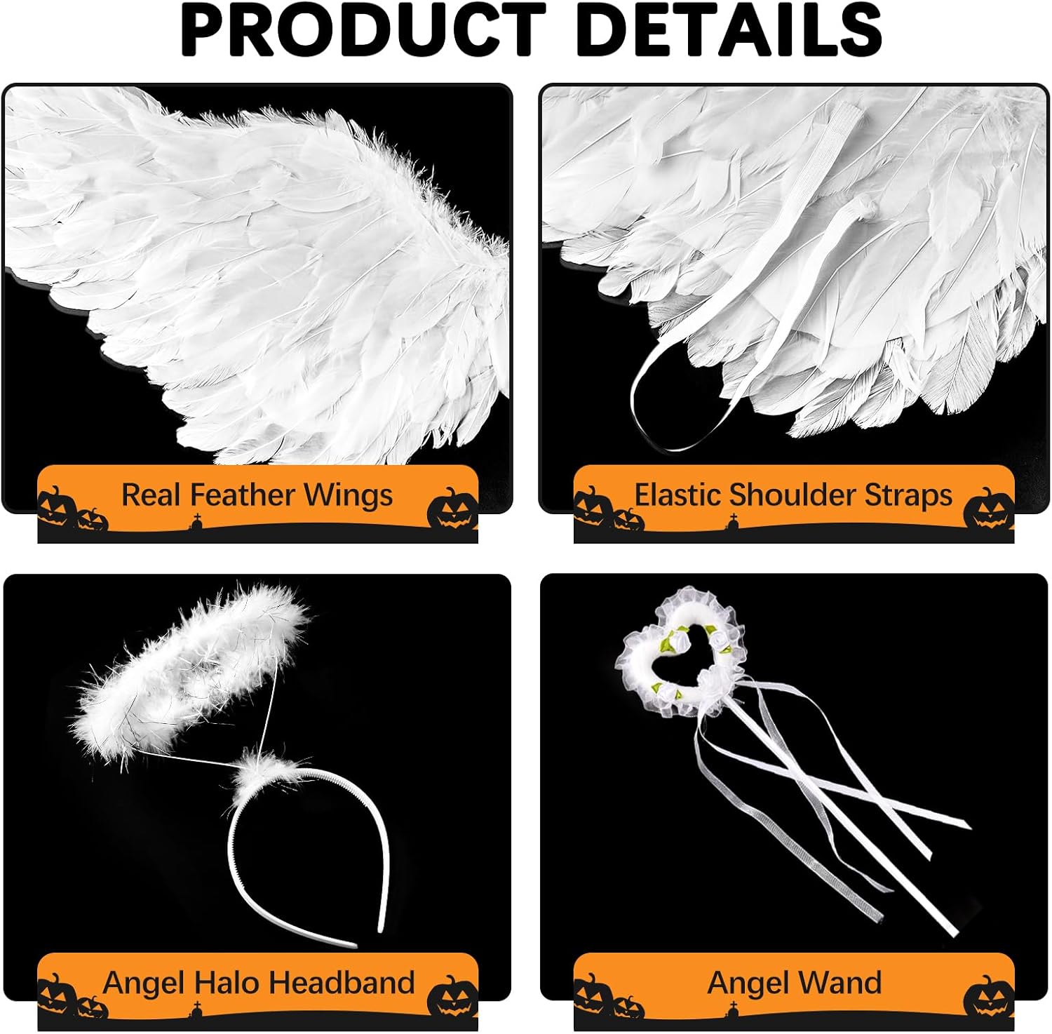 Zezzxu Set de Alas de Ángel y Varita Mágica de Halo para Niños, Niñas, Adultos y Mujeres, Blanco y Negro, Tamaños Pequeño y Grande a elegir