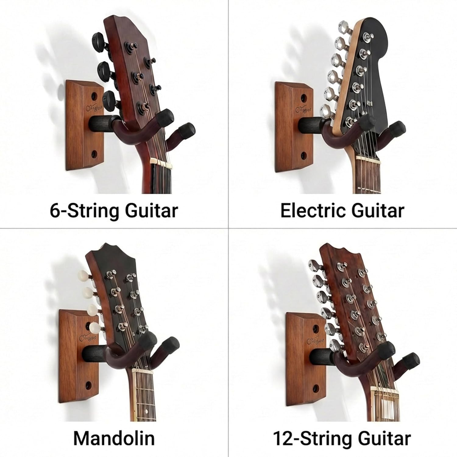Diseño Giratorio: El yugo del soporte de guitarra de madera maciza es ajustable, este yugo giratorio se adapta a una multitud de diseños de cabezales, especialmente para acomodar cabezales no simétricos. La guitarra puede acceder fácilmente al colgador y ser sostenida por él. Un soporte de pared para guitarra con varios soportes de compatibilidad puede ayudarlo a resolver todos los problemas de los soportes de pared para guitarras generales y ahorrarle costos innecesarios. La mejor opción para accesorios de guitarra