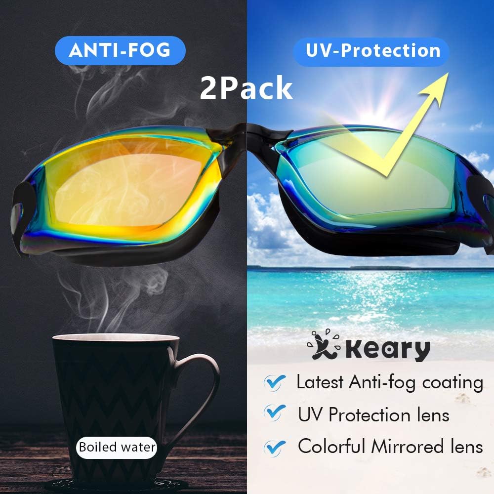 Keary 2 Pack Anti-Fog Swim Goggles for Adult Youth Kids 6+, Anti-UV Waterproof Triathlon Pool Goggles with 3 Nose Pieces