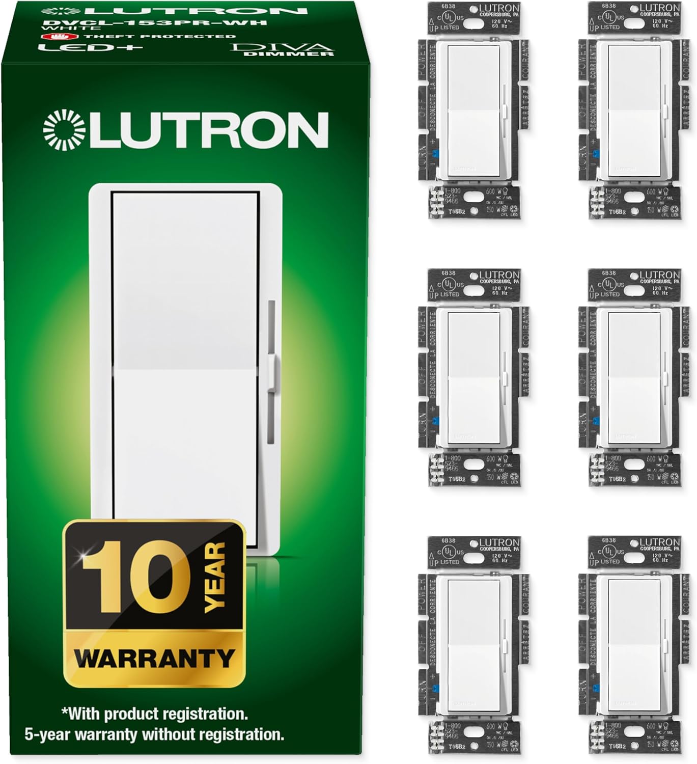 Lutron Diva LED+ Dimmer Light Switch for Dimmable LED, Halogen, and Incandescent Bulbs, 150 Watt, Single-Pole or 3-Way, DVCL-153P-WH-6, White, 6 Pack