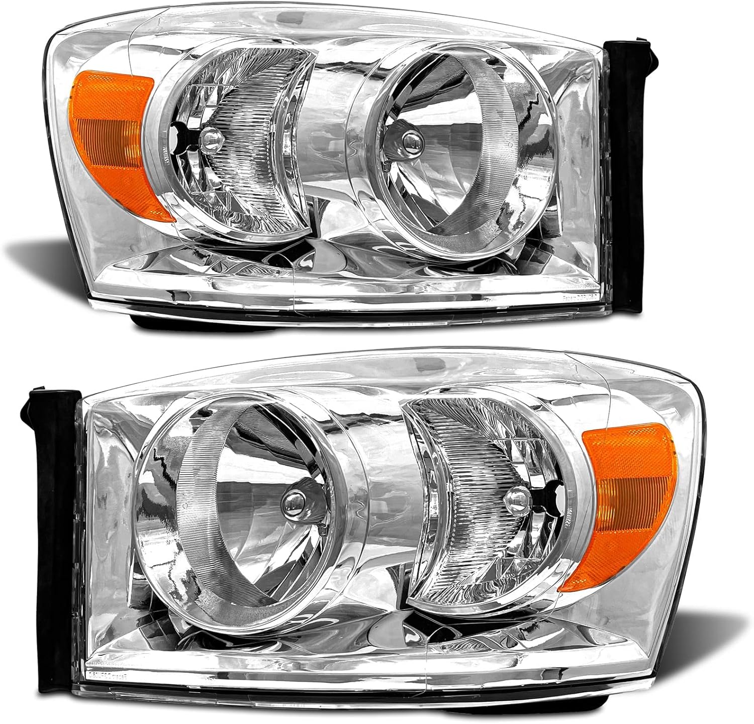 2006 2007 2008 2009 Dodge Ram Headlight Assembly for 2006-2008 Do dge Ram 1500/2006-2009 Dodge Ram 2500 3500 Clear Lens Chrome Housing Amber Reflector Headlamp Replacement Left Right Pair
