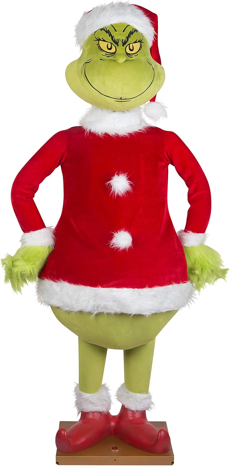 This amazing life-size animated Grinch makes an impressive addition to your holiday decor. Programmed with Grinch spoken expressions and movements, our animated Grinch also plays "You're a Mean One Mr. Grinch" from the classic children's Christmas movie, "How the Grinch Stole Christmas". Our luxurious 5.5 foot Grinch comes dressed as Santa and features soft, plush fabrics with fuzzy trim accents. Includes push-button activation and a motion sensor with off switch. Perfect for Grinch fans and decorating enthusiasts alike, this life-size animated Grinch makes a unique and notable statement.