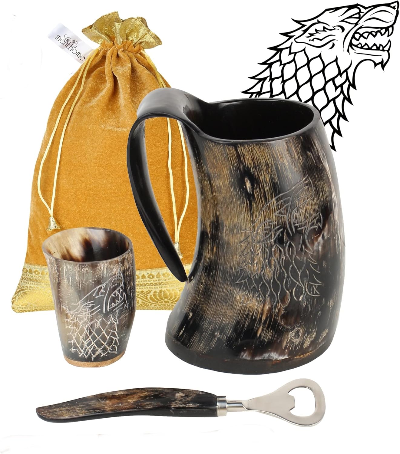 🍻 MEDIEVAL STYLE VIKING HORN SET - Our Viking Game of Thrones-inspired mug is handcrafted for men and women who love rustic classic medieval style horns. The set includes - Drinking Mug, Horn Bottle Opener, Shot Glass, Horn Spoon, and a beautiful Golden Bag. Our horn's blazingly polished finish exterior brought to an ideal smoothness and shine is the first symbol of excellence. Go for it today!