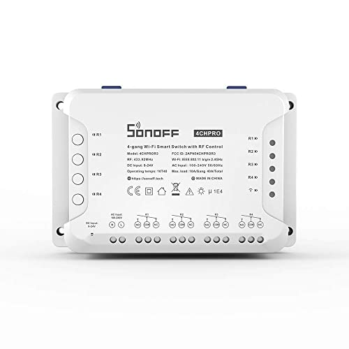 SONOFF 4CH Pro R3 Interruptor Inteligente Wi-Fi de 4 Canales Montaje en Rail Din Automatización Doméstica, Control de Electrodomésticos Auto-Bloqueante/Interbloqueo, Control RF/APP/Voz/LAN, Compatible con Alexa (1 Unidad)