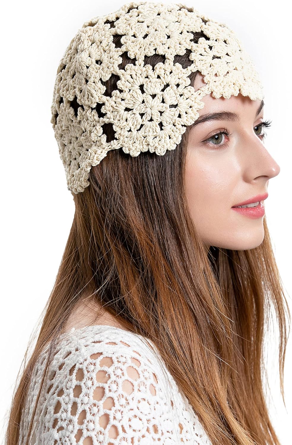 ZLYC Women Cotton Crochet Skull Cap Handmade Knit Cutout Floral Beanie Hat