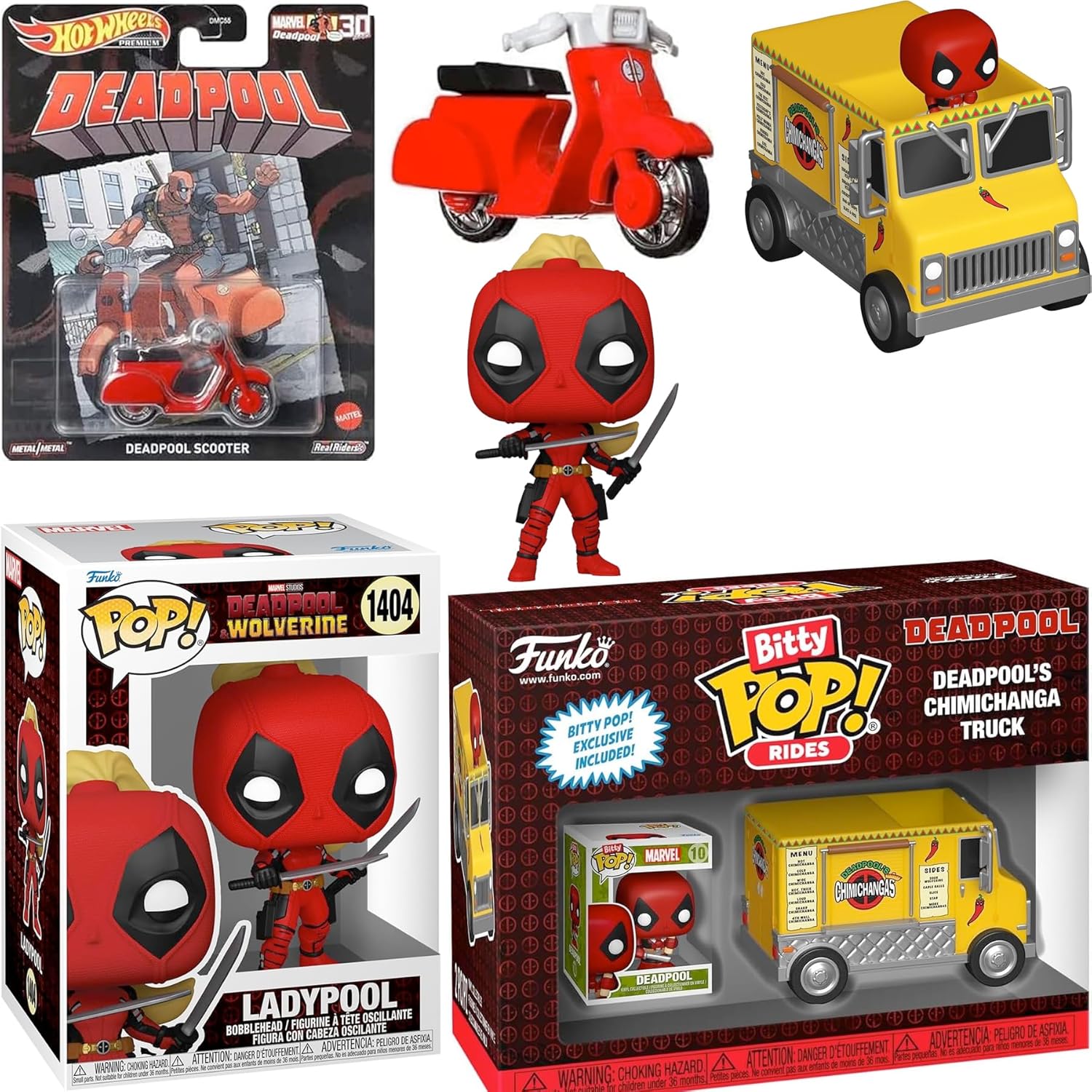 Pool de botín de Marvel Deadpool Wolverine Pop! Figura de vinilo Ladypool incluida con camión de Chimichanga de Marvel Bitty + Patinete Die-Cast de 3 artículos