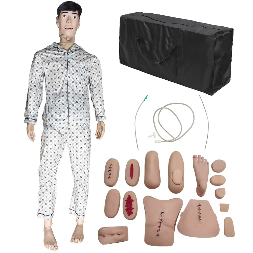 ➤ Simula el cuidado del paciente: el maniquí de entrenamiento en enfermería es de tamaño natural (175 cm/5,7 pies), pesa aproximadamente 33 libras/15 kg, tiene una flexibilidad realista de las extremidades y las articulaciones, se puede realizar en varias posiciones, permite simular que los pacientes se bañan y se cambian de ropa en la cama. Se puede abrir la cavidad torácica y observar los pulmones simulados y el estómago. La estructura anatómica estándar facilita el aprendizaje