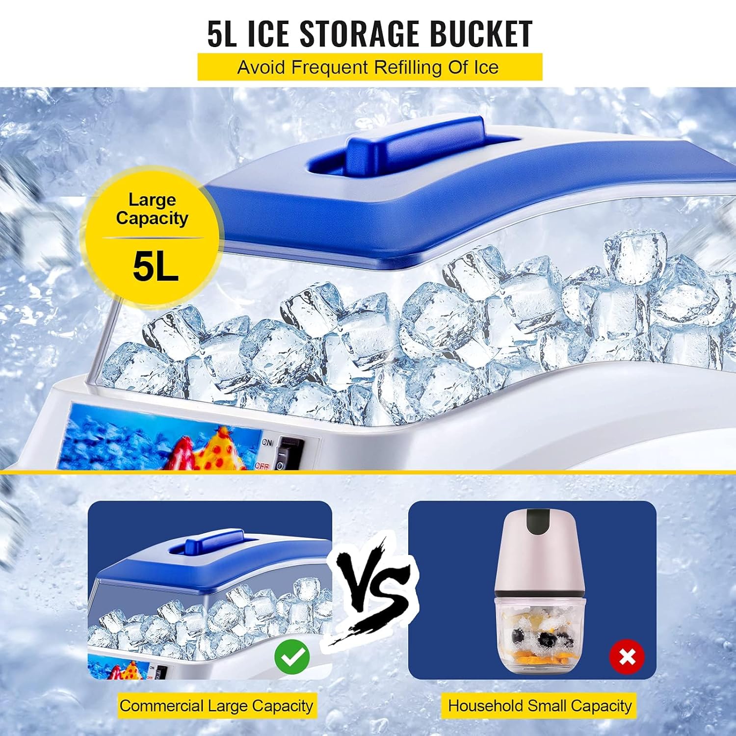 Operación Simple: Nuestra máquina picadora de hielo es fácil de usar con solo un botón. Puede triturar tanto partículas pequeñas de hielo como cubos grandes de hielo, y viene con una bandeja de recolección de hielo incorporada que puede contener hasta 5L de hielo picado. Si la máquina se atasca, simplemente presione el botón de marcha atrás para ajustar. La operación simple hace que sea fácil de usar para cualquiera.
