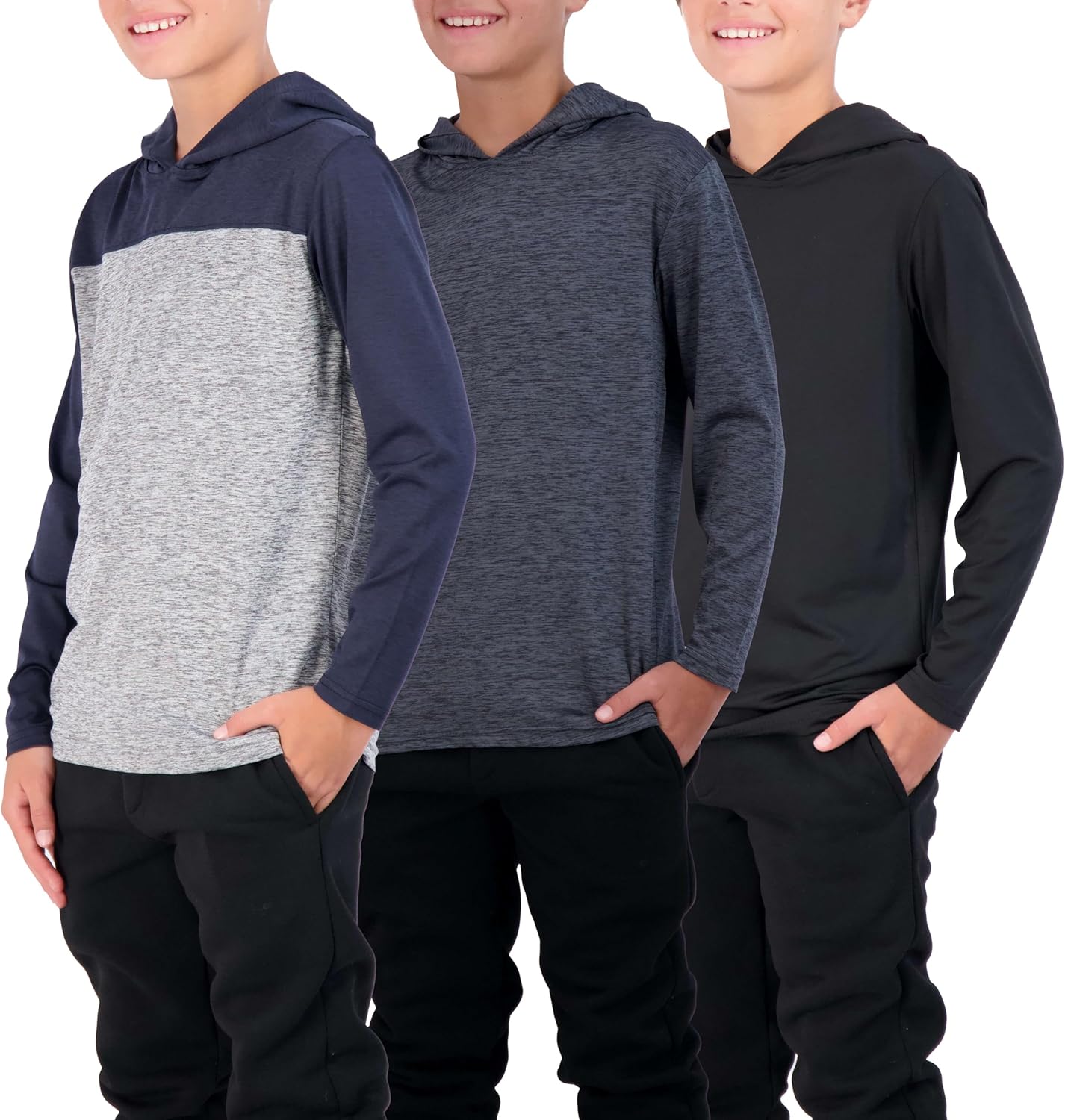 Real Essentials 3 Pack: Dry-Fit Youth Boys Teen Active Long Sleeve Hoodie Sweatshirts - Hooded Pullover Shirts