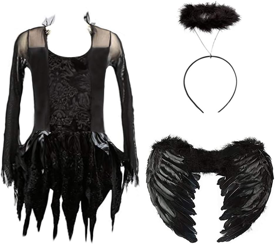 Koatobbor Girls Fallen Angle Costume Black Fancy Party Dress with Headband and Wings
