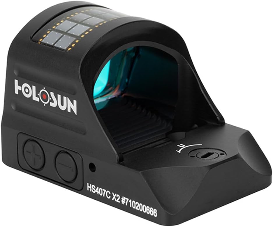 HOLOSUN RED DOT SIGHT - The HS407C X2 is an open reflex sight designed for full-sized pistol applications; It provides a large field of view that will help you increase accuracy and quickly acquire targets; This handgun sight features Lock Mode that locks the buttons preventing inadvertent setting changes