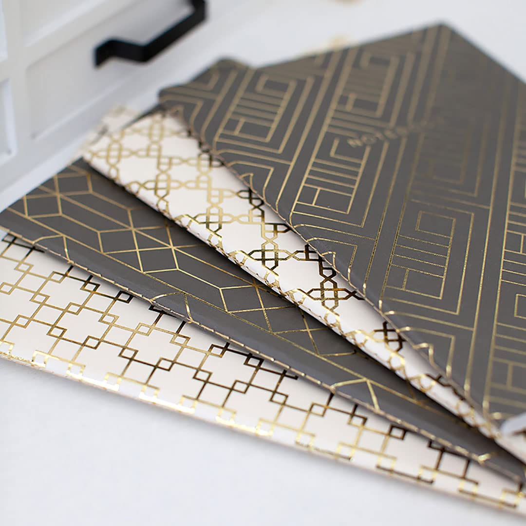 BLU MONACO Trendy Decorative Lined Geometric Notebook Set of 4 (6 x 8.5) - Dark Grey & Cream with Gold Foil Journals for Women