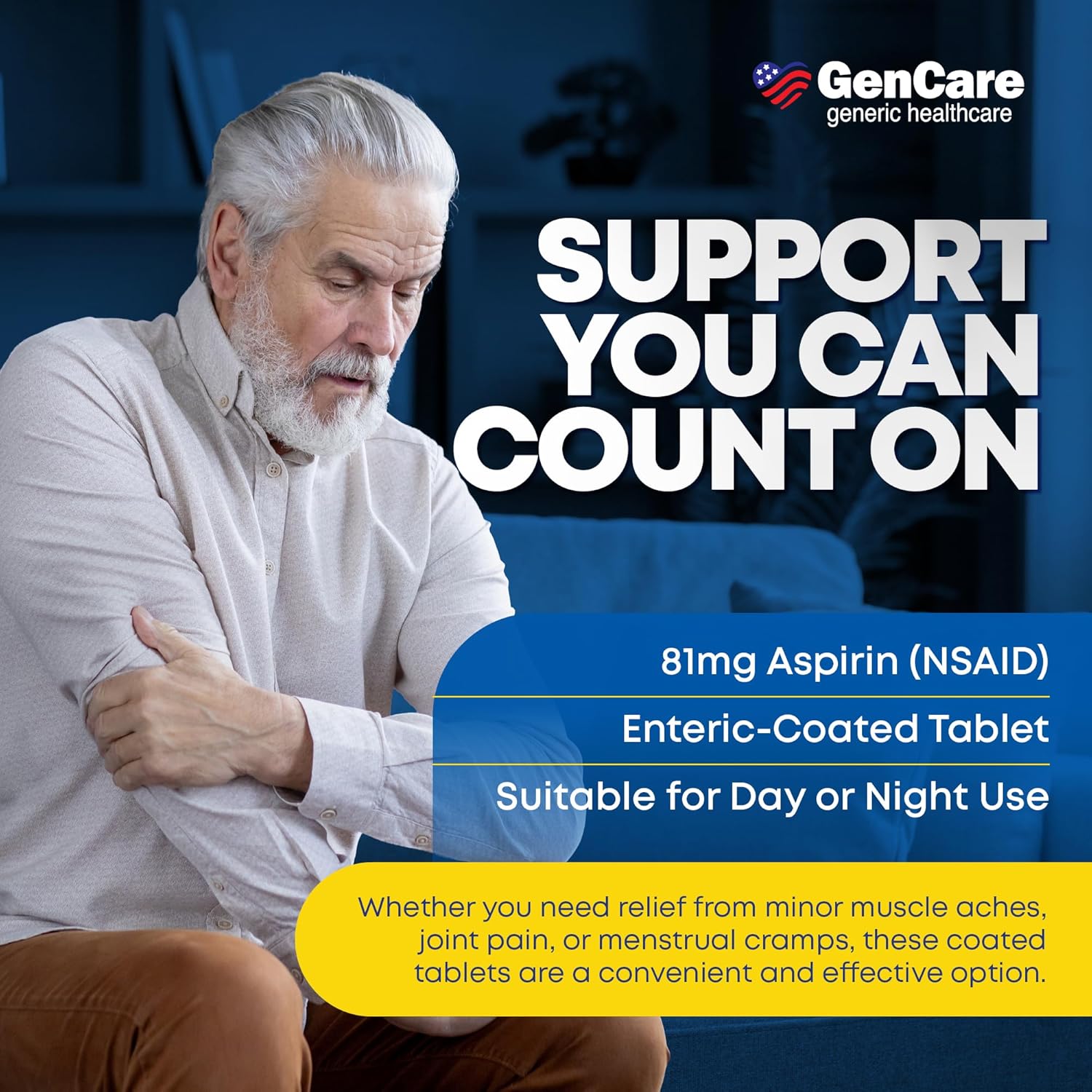 GenCare - Low Dose Aspirin 81mg for Adults Coated (NSAID) 500 Tablets | Adult Low Dose | Enteric Coated Aspirin Pills | Muscle Pain & Menstrual Pain Relief | Fever Reducer | Generic Bayer