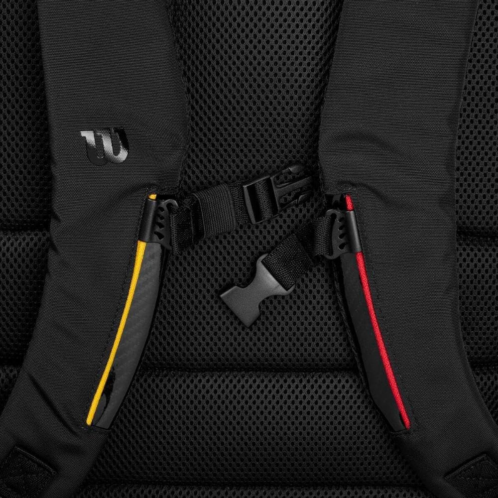 Combinando un diseño que rinde homenaje a la icónica franquicia Pro Staff con un rendimiento funcional de primer nivel, la Colección Super Tour Pro Staff está diseñada para los puristas del tenis en todo el mundo. Esta mochila Pro Staff contiene hasta dos raquetas en un compartimento acolchado con cremalleras de cierre para mayor seguridad. Las características adicionales incluyen un compartimento adicional con funda para portátiles o tabletas, un bolsillo ventilado para zapatos o ropa sucia, y un bolsillo lateral con cremallera forrado con Thermoguard para mantener agua o bocadillos frescos.