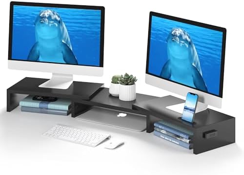 DUAL MONITOR STAND WITH ADJUSTABLE LENGTH & ANGLE - Elevate two monitors to an ergonomic height for better viewing and productivity. Adjustable from 31.5" to 42.5", this monitor stand fits both smaller and larger desks, serving as a reliable desk organizer for flexible workspace setups