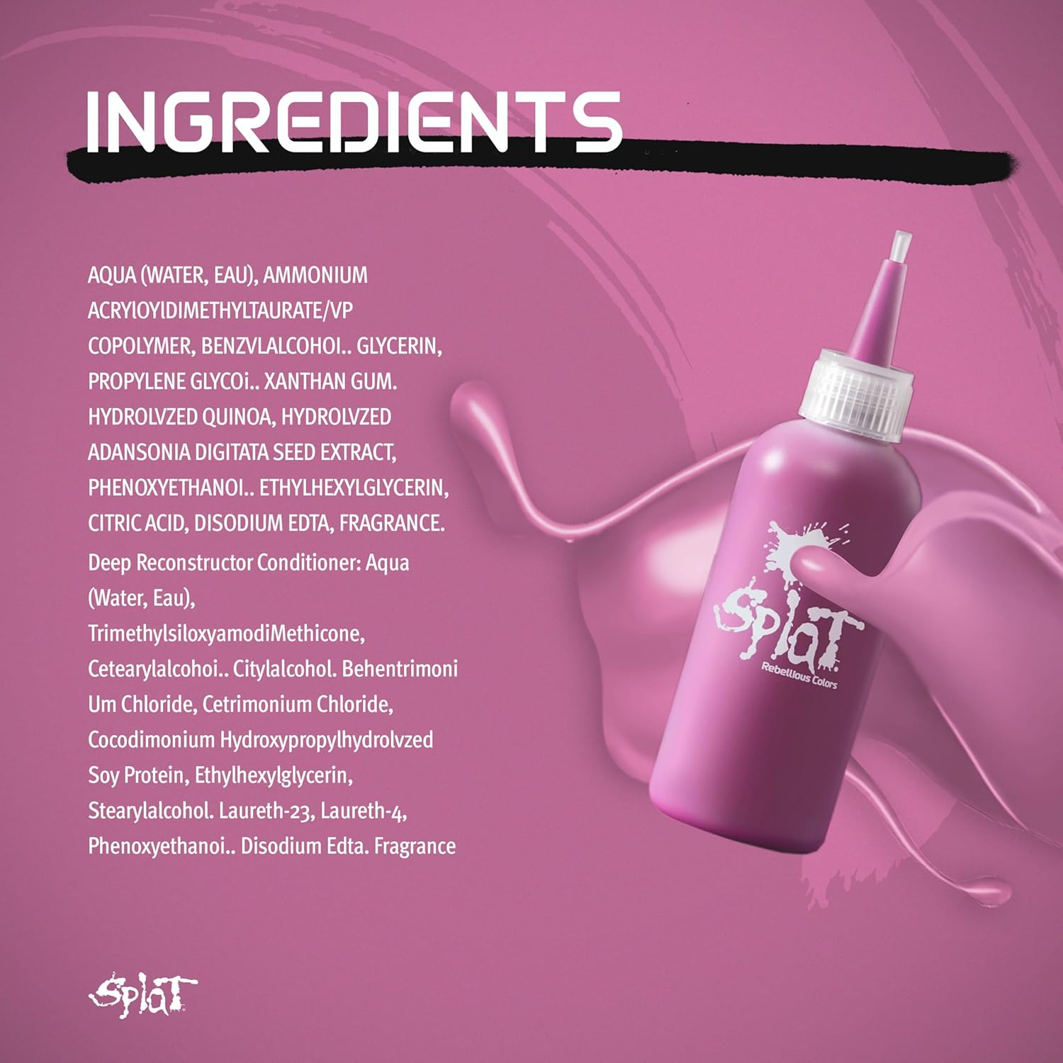 Express your creativity and individuality with a beautiful, vibrant hair color. Featuring a 6-ounce bottle of pink hair dye, a deep reconstructor conditioner, 1 pair of gloves, and an instruction sheet, Splat Midnight Rosetta hair dye kit for blondes includes everything you need to be bold. Made with baobab and quinoa extracts, our dye nourishes hair, improves shine, locks in color, and provides protection against breakage. This no bleach kit makes coloring a little easier, resulting in a shade that lasts up to 30 washes or longer, depending on hair type. Works best on pale blonde hair and previously bleached hair. Dark hair will need to be lightened for vibrant results. See complete instructions for more information and cautions.