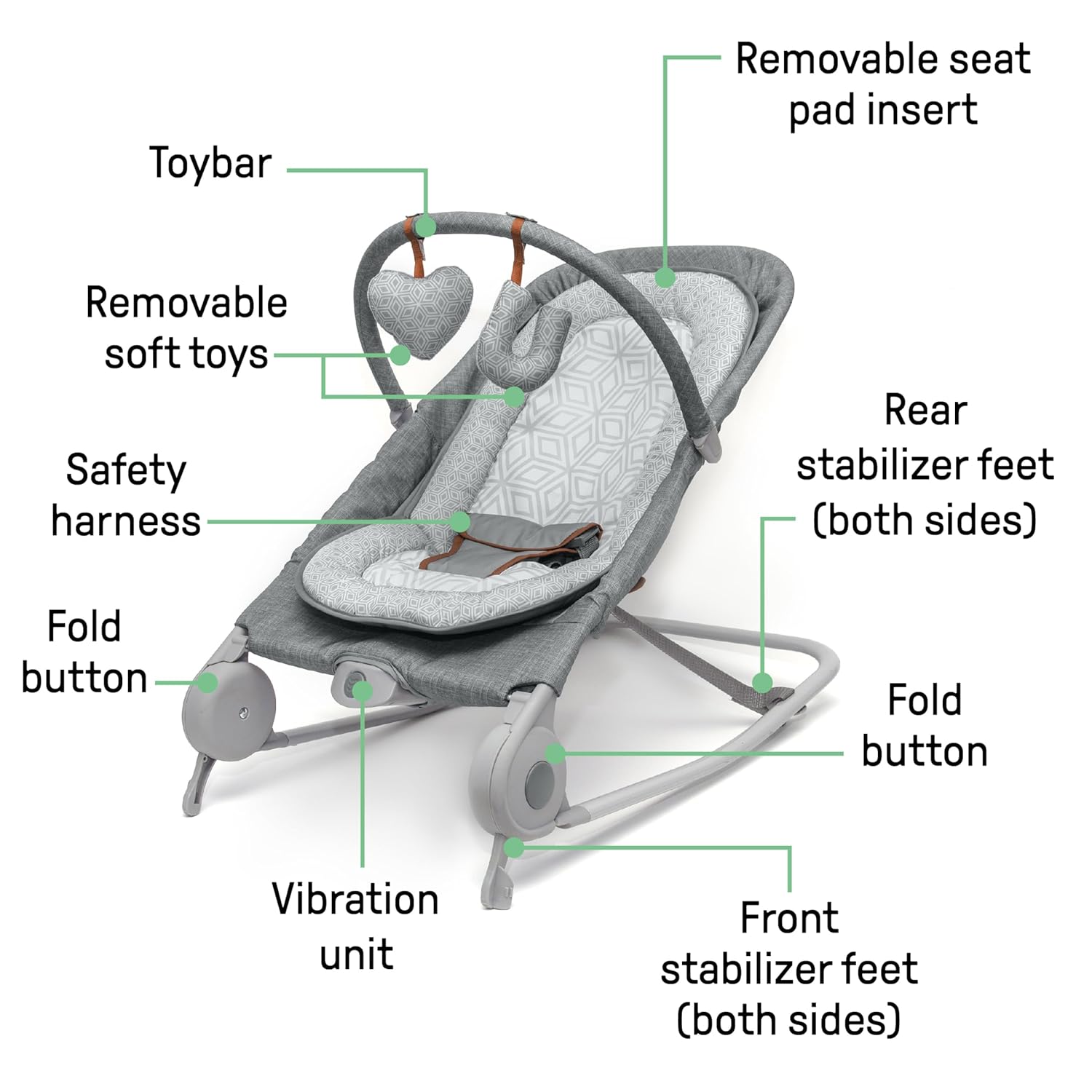 FOLDS FLAT: Lightweight and portable, 2-in-1 Bouncer & Rocker Duo folds flat for storage and travel. The removeable seat is machine washable.