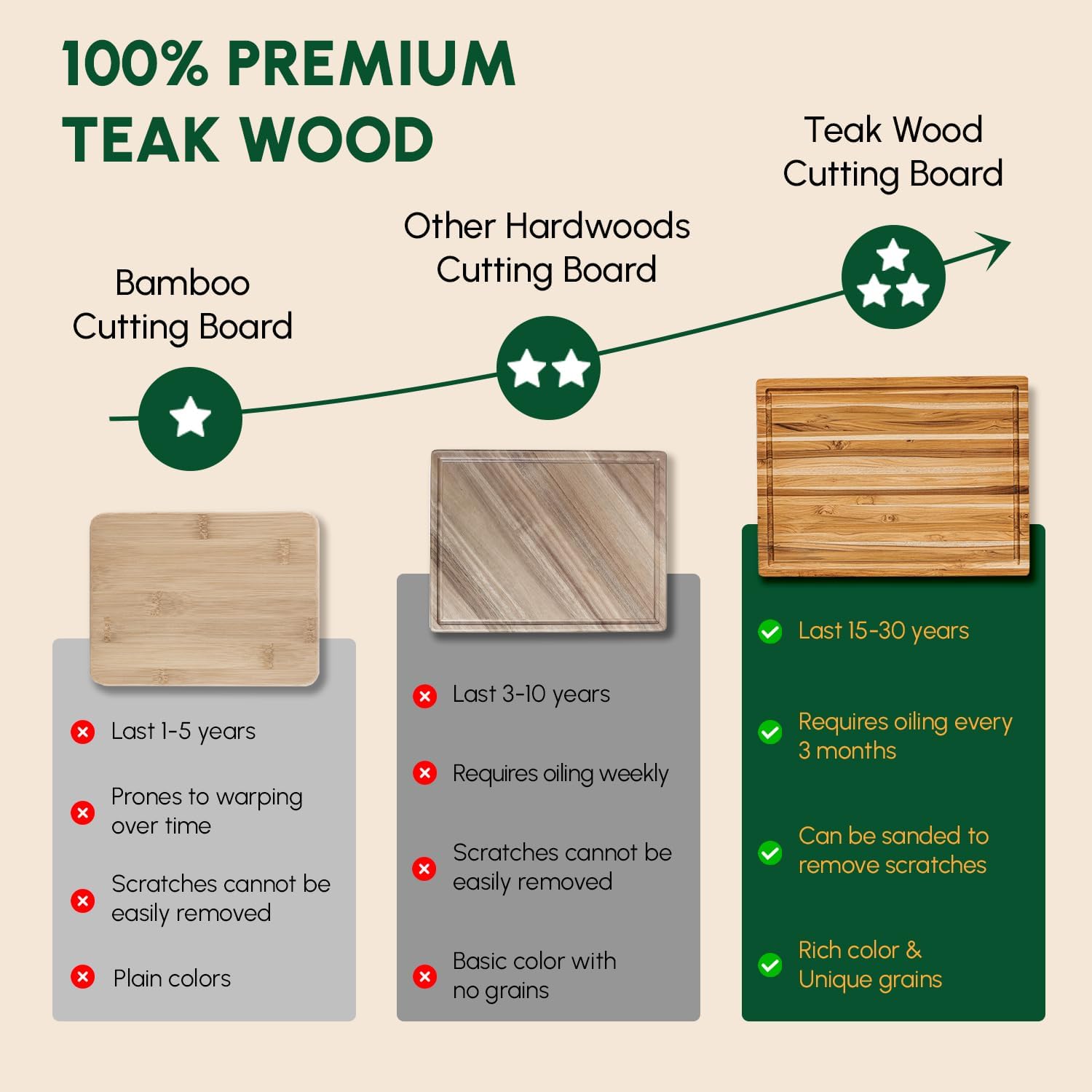 LONG-LASTING QUALITY - Crafted from durable hardwood Southeast Asian Teak, renowned for its moisture resistance and strength, our heavy-duty, long-lasting cutting boards wood are designed to be your reliable kitchen companion for years to come. Spend less time worrying about replacements and more time enjoying cooking for your family.