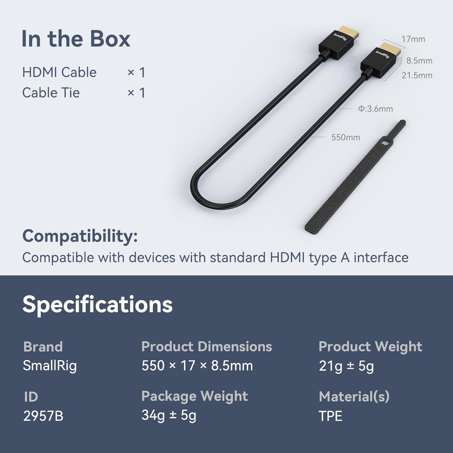 SmallRig Upgraded Ultra Thin HDMI Cable 55cm/1.8Ft (A to A), 4K Hyper Super Flexible Slim Cord, High Speed Supports 3D, 4K@60Hz, Ethernet, ARC Type-A Male to Male for Camera, Monitor, Gimbal - 2957B