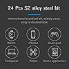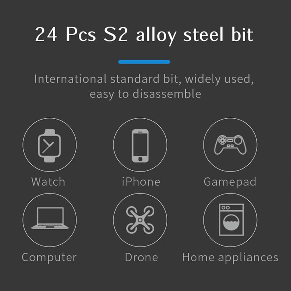 24 puntas de precisión para uso múltiple - Las puntas de acero S2 tienen una vida útil más larga con dureza de hasta 60 HRC, 24 destornilladores incluyen diferentes tamaños de Philips, ranura, Torx de seguridad, Hex, Pentalobe, Torx, Triángulo, Y tri-wing, Fozidriv, Cuadrado, U-Type.