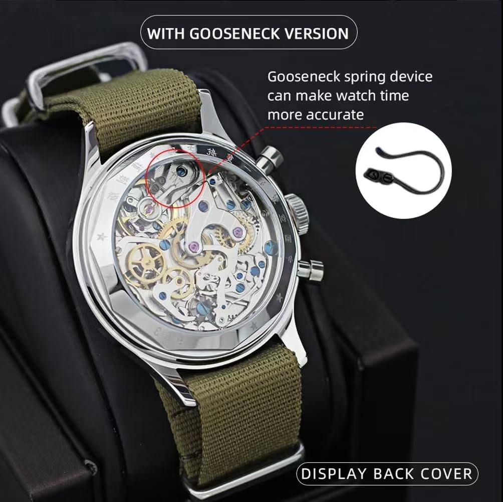 1. About the SEAKOSS 1963 Airforce Chronograph Watch: This edition 1963 watch is a unique and classic masterpiece. The gold tint creme dial features gold tone numbers and markers. Equipped with ST1901 Hand Winding mechanical chronograph movement, with 21 jewels, 21,600 VPH and shock protection. The chronograph watch uses a column wheel movement,which is considered by most watch enthusiasts to be the most desirable since it requires the greatest skill to design and build correctly and it is thought to be the most durable. The sub-dial on the left is the running seconds counter and the sub-dial on the right is a 30-minute timer. The red second hand is activated when you click the pusher at 2:00. 2. Wristwatch Features:Brand: SEAKOSS, Movement: ST1901 Hand Wind Mechanical Chronograph Movement (Note: Add gooseneck spring regulator device)Case: Polished Stainless Steel 316L, 38mm diameter x 14.5mm thickBack: Exhibition window clear caseback, Dial window material: Acrylic glass 2.5D curved mirror, Band: Olive green style strap, buckle closure3. Gift box package includes: 1*Pilot Chronograph Watch + 1*Original nylon strap + 1*Clean watch cloth + 1*Manual.