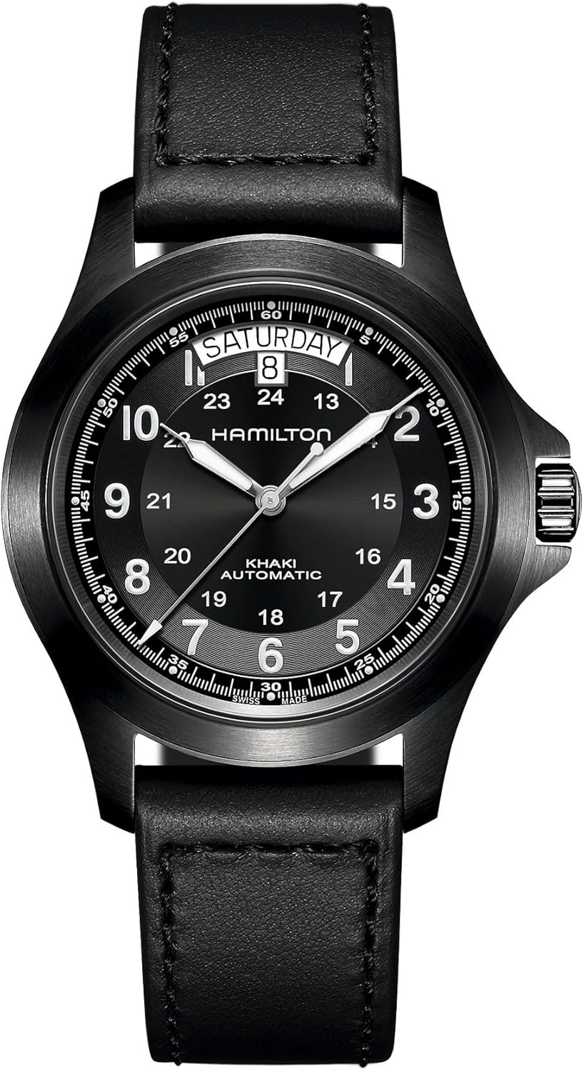 Inspired by Hamilton's military heritage, our field watches are rugged and resilient. Perfect for after-dark heroics, the Khaki Field King Auto features a black PVD-coated case, black dial and black leather strap for the ultimate in stealth style.