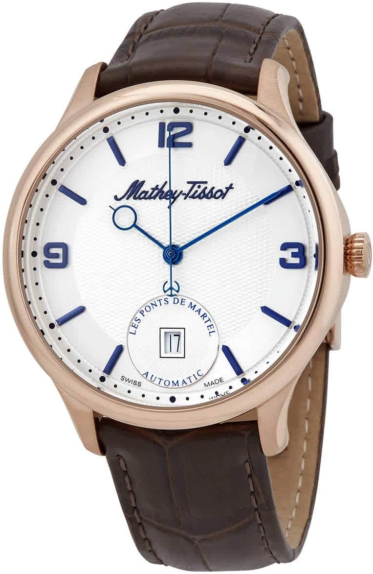 Dial blanco realzado con agujas de estilo breguet azul. Caja de acero inoxidable con PVD en oro rosa y correa de cuero marrón. Movimiento automático. Resistencia al agua de 50 metros / 165 pies. Bisel fijo. Cristal de zafiro resistente a los arañazos. Fondo de caja transparente. Hebilla de ancla. Corona de tracción / empuje. Tamaño de la caja 42 mm x 11 mm. Reloj automático Mathey-Tissot AC1886PI Edmond.