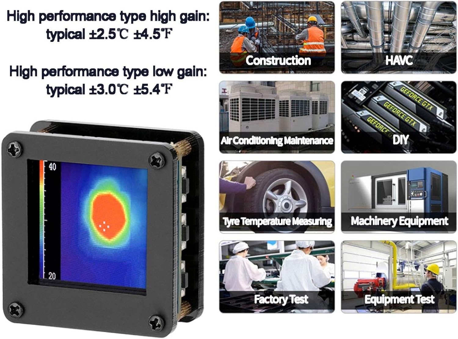 100% brand new and high quality Features This is an infrared thermal imager that combines the functions of surface temperature measurement and real-time thermal imaging. The traditional thermal imaging camera needs to measure each component one by one, while this instrument does not need to. Therefore, it helps to save your time. Even the potential problems can be clearly displayed on the color screen which helps users quickly locate the central point to measure cursor and temperature. Made of fine quality material, practical, easy to operate and use, wide application range, has a long service life. The module can be powered directly by USB 5V to produce infrared images. Use AMG8833 infrared thermal sensor. The resolution is 8x8, and the farthest detection distance is 7 meters. It can be applied to check electronic products. Portable and compact, high performance, easy to use. Specification Product name Infrared Thermal Imager Temperature accuracy High performance type high gain typical ±2.5Degree C ±4.5 Degree F High performance type low gain typical ±3.0Degree C ±5.4 Degree F Human detection distance 7m or less reference value 22.966 ft NETD Typ. 0.05Degree C 32.900 Degree F 1Hz Typ. 0.16Degree C 32.288 Degree F 10Hz Viewing angle typical 60 Degree Optical axis within typical ±5.6 Degree Current consumption Typical 4.5mA normal mode Typical 0.2mA sleep mode Typical 0.8mA stand-by mode