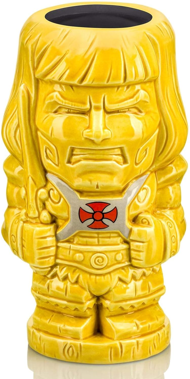 Tropical Design: Based on the hero of Eternia, this collectible Geeki Tikis mug depicts He-Man. Combining fun tiki styling, the tropical mug features vibrant yellow coloring and the hero's iconic chest plate.