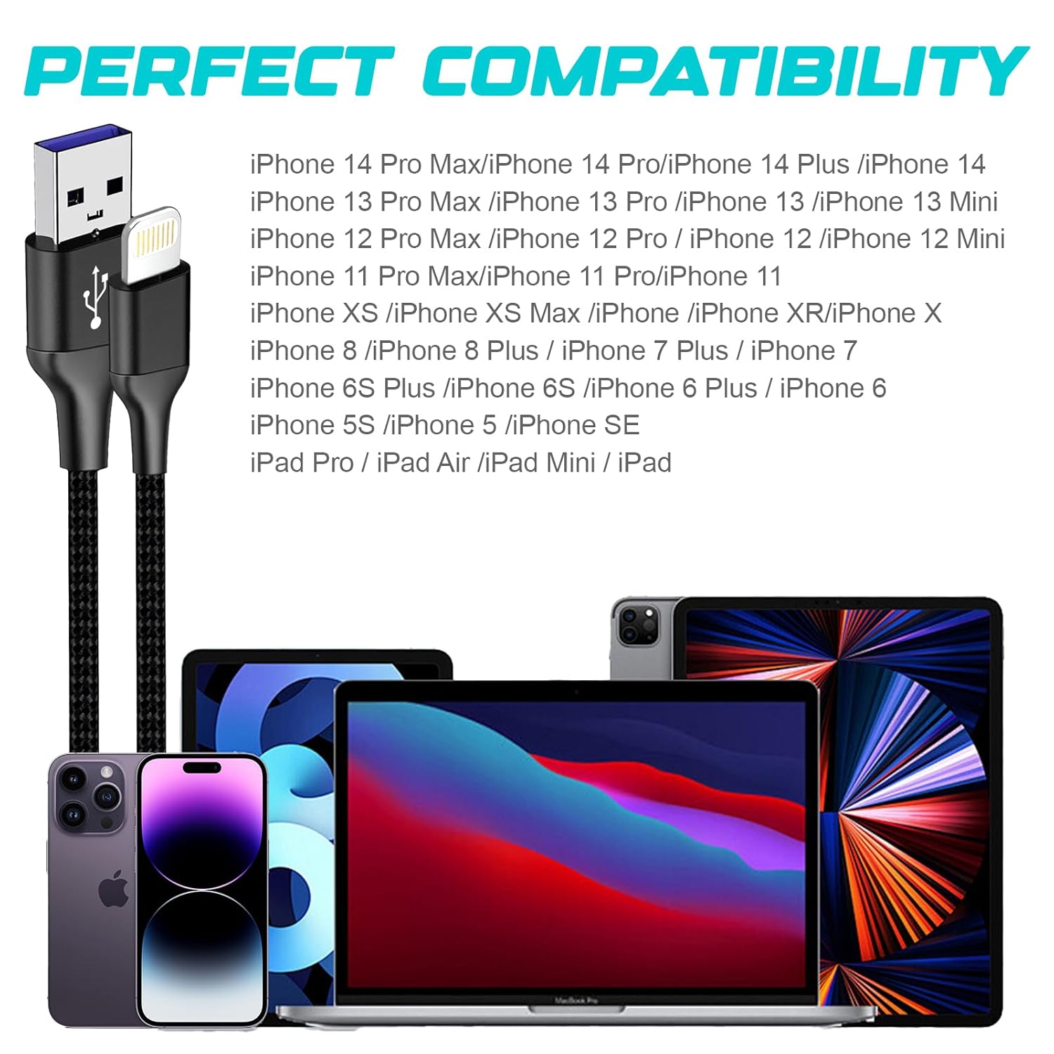 Componentes Premium El blindaje de elastómero termoplástico (TPE) proporciona una durabilidad y protección superiores para el cableado interno, diseñado específicamente para soportar los protocolos de carga más avanzados. Calidad superior que soporta una carga rápida y segura (2.4A) y una transferencia de datos rápida (480Mbps). Funciona mejor y carga tus dispositivos más rápido. Compatibilidad Universal Certificado MFi para funcionar perfectamente con cualquier dispositivo que utiliza un conector Lightning. - iPhone 14 / 14 pro / 14 pro Max / 14 Plus - iPhone 13 / 13 Pro / 13 Pro Max / 13 Mini - iPhone 12 / 12 Pro / 12 Pro Max / 12 Mini - iPhone SE 2020 - iPhone 11 / 11 Pro / 11 Pro Max - iPhone X / XR / XS / XS Max - iPhone 8 / 8 Plus - iPhone 7 / 7 Plus - iPhone 6s / 6s Plus / 6 / 6 Plus - iPhone 5 / 5S / 5C / SE - iPad Pro, iPad Air, iPad Air 2 - iPad mini / iPad mini 2 / iPad mini 3 / iPad mini 4 - iPod Touch 5ta Gen / iPod Nano 7ma Gen y más dispositivos futuros Dura toda la vida Para demostrar nuestra confianza, ofrecemos un reemplazo sin problemas por todos los problemas de calidad. No por medio año, no por 18 meses, sino por toda la vida. Puede que sea el último cable que necesites comprar.