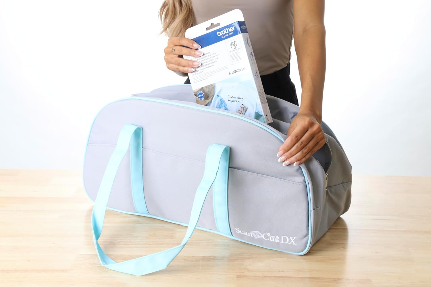 LLEVAR LA BOLSA DE LONA ScanNCut DX de Brother está hecha de tela duradera, cierre de cremallera para mayor seguridad, correas para llevarla al hombro o al costado, bolsillos exteriores y espacio generoso para llevar su máquina y muchos accesorios de artesanía y suministros