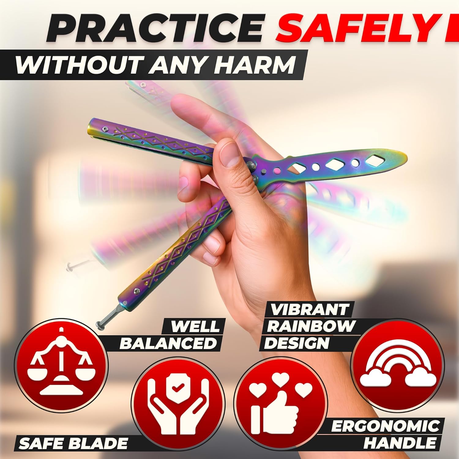 Rainbow 8.2" Practice Butterfly Knife Trainer with Safe Blade - Metal Training Butterfly Knife Practice With Strong & Comfortable Handles - Well-Balanced Gradient Balisong Trainer for Smooth Flipping