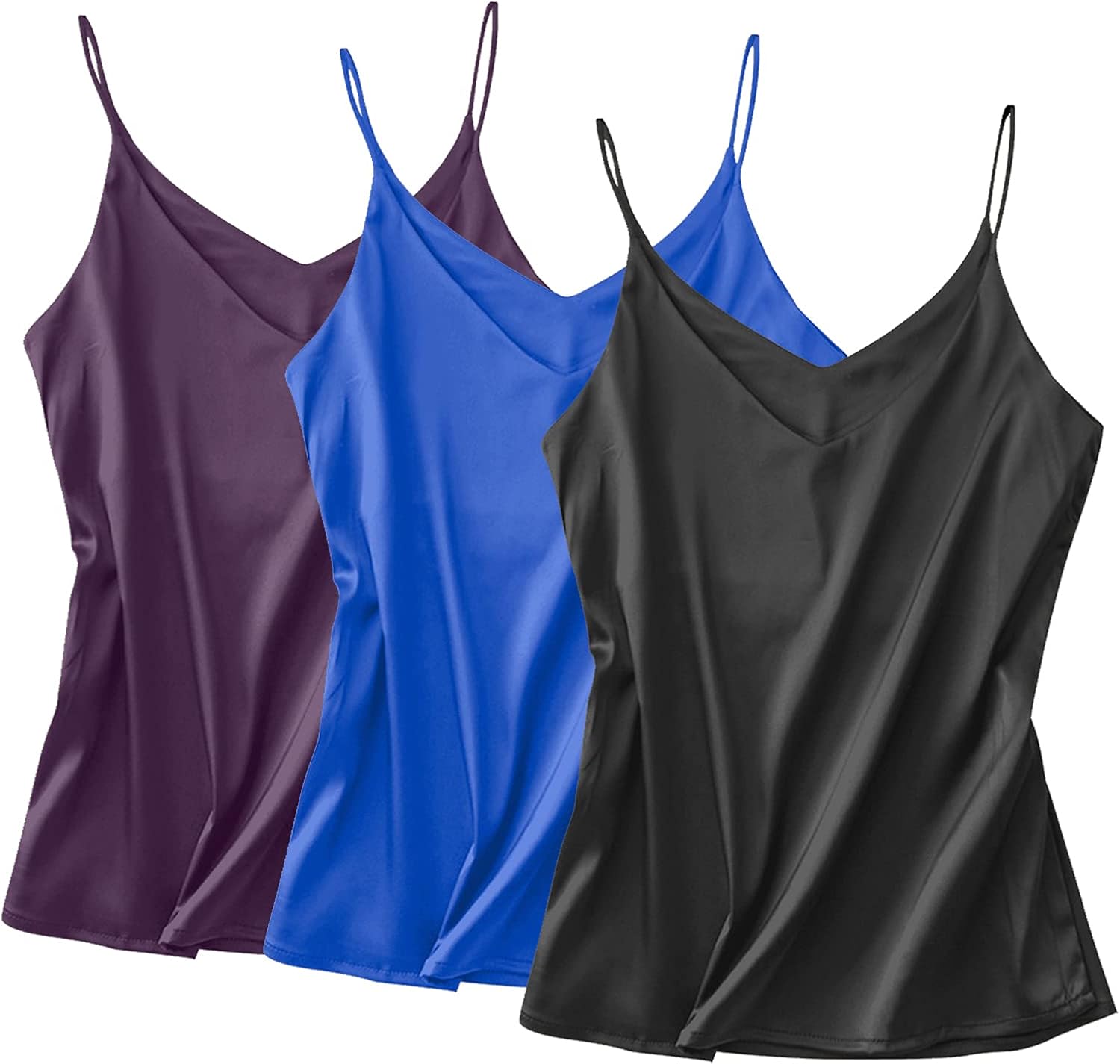 Miqieer Basic 3 Pack Women's Silk Tank Top Ladies V-Neck Camisole Silky Loose Sleeveless Blouse Tank Shirt with Soft Satin
