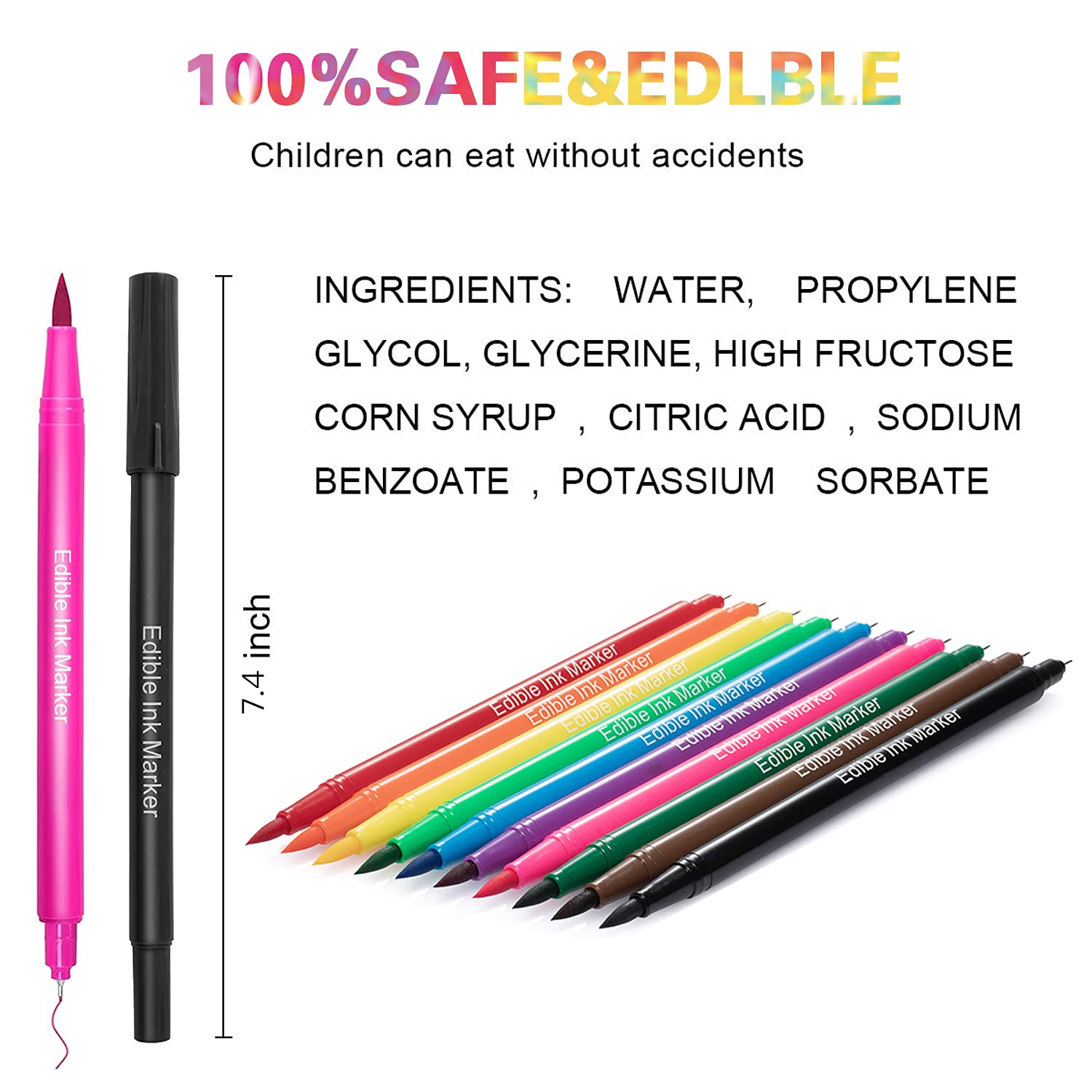 【12 bolígrafos para colorear alimentos】:12 marcadores para colorantes para alimentos con 3 rotuladores comestibles de color negro en el interior. El kit incluye todos los colores que necesitas: negro, rojo, amarillo, verde oscuro, verde claro, azul, marrón, rosa, morado y naranja. (2 bolígrafos negros más de regalo). 【Plumas de doble punta】: este rotulador de alimentos tiene doble punta con punta gruesa y fina. La punta ancha y lisa facilita la coloración y la decoración. La punta suave y puntiaguda es casi como un pincel para crear una línea ancha para escribir. El bolígrafo para decoración de tartas también es adecuado para la impresión de plantillas y el diseño de contornos. 【Amplio uso】: estos bolígrafos comestibles se pueden utilizar en la mayoría de superficies lisas y secas, como fondant, galletas, pasteles, rosquillas, chocolate, malvaviscos, bagels, pita, crepes e incluso quesos duros, etc. Ideal para juegos infantiles y de bricolaje diarios, cumpleaños, fiestas, bodas, aniversarios y juegos de bricolaje familiares para padres e hijos, etc. (Nota: no apto para superficies de cera) Aptos para niños: rotuladores para escribir alimentos: ideales para manualidades y juegos infantiles diarios. Fácil y divertido de usar para los niños, permite a los niños decorar la comida como quieran, proporciona una forma segura de pintar y dibujar. También es perfecto para estampar, estampar o crear garabatos. 【Seguro y comestible】: Los marcadores comestibles aptos para uso alimentario se fabricaron con tinta comestible de calidad alimentaria, no tóxica, para que los niños puedan comer sin accidentes. ¡Tenga la seguridad de usarlo! Inodoro e insípido, no altera el sabor. Certificado kosher. Apto para vegetarianos. 【Calidad confiable y servicio excelente las 24 horas】Siempre nos centramos en la calidad del producto y una experiencia de cliente superior, y le ofreceremos un servicio postventa las 24 horas. No dude en contactarnos si tiene alguna pregunta sobre estas marcas de pigmento 【Garantía de servicio al cliente del 100%】: Si por alguna razón el producto no cumple tus expectativas, simplemente devuélvelo o solicita un reembolso completo.