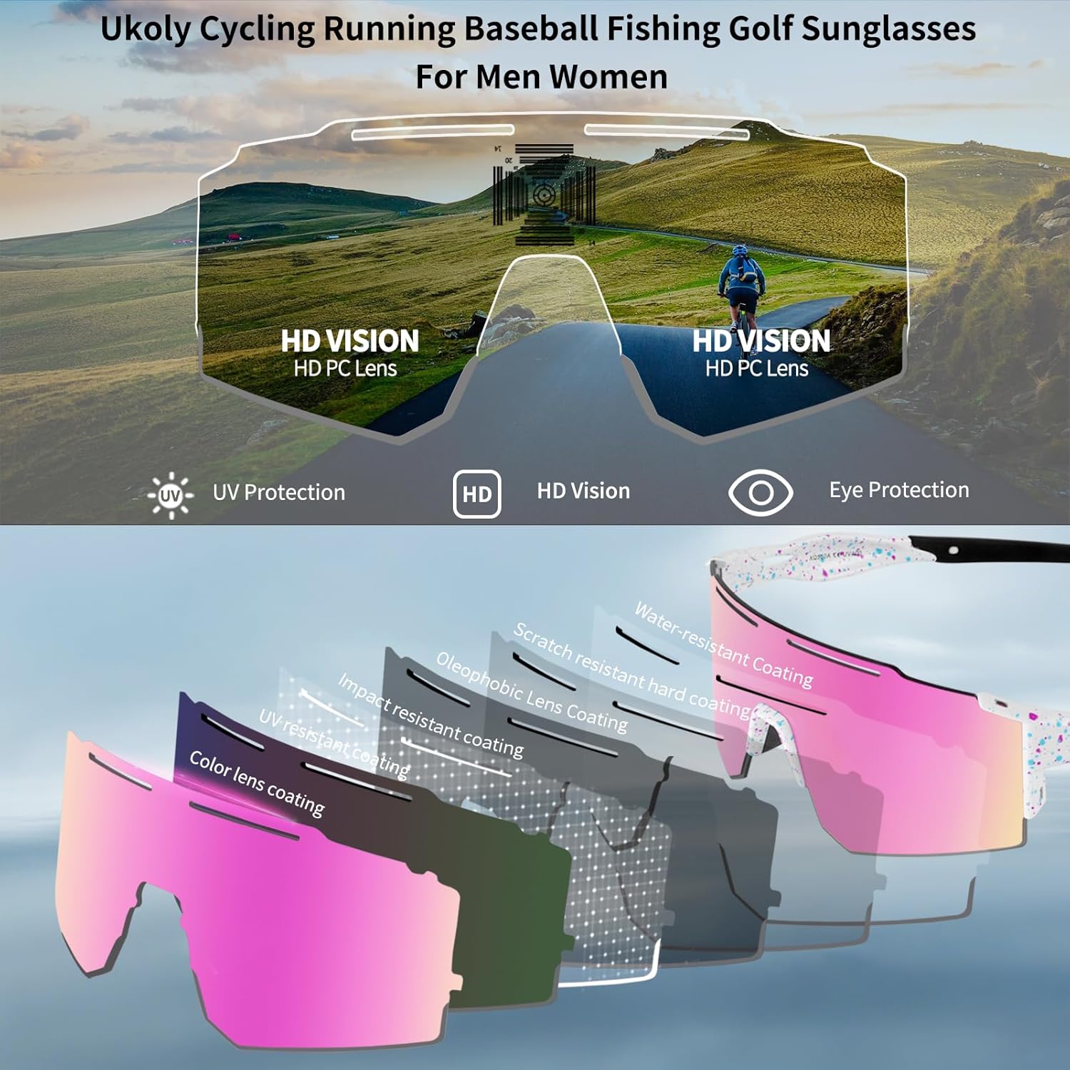 Gafas de Ciclismo Ukoly para Hombres y Mujeres con 3 Lentes Intercambiables, Gafas Deportivas Polarizadas, Gafas de Béisbol