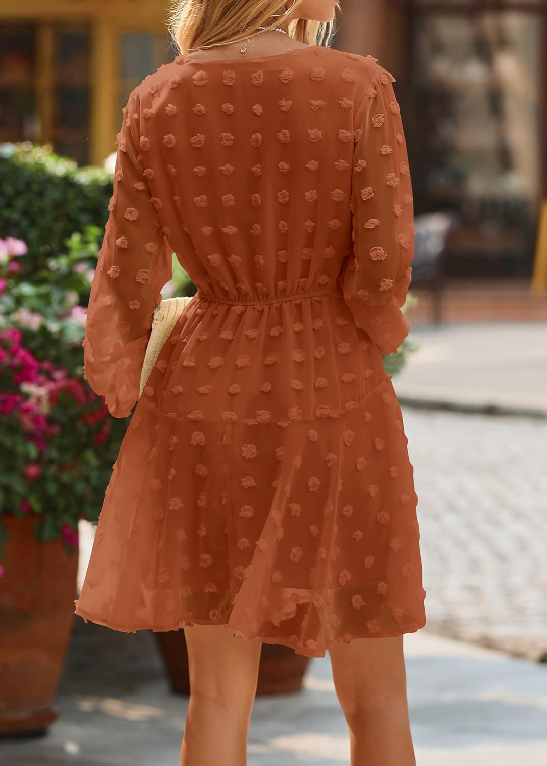 KIRUNDO Women's 2024 Spring Summer Long Sleeve V Neck Flowy Mini Dress Swiss Dot High Waist Chiffon Casual Dresses(Brown, Small)