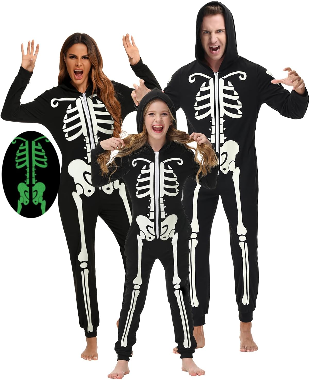 Veseacky Matching Family Pajamas Sets Skeleton Glow in Dark Jumpsuit Halloween Hooded One-Piece Zipper PJS Family Jammies