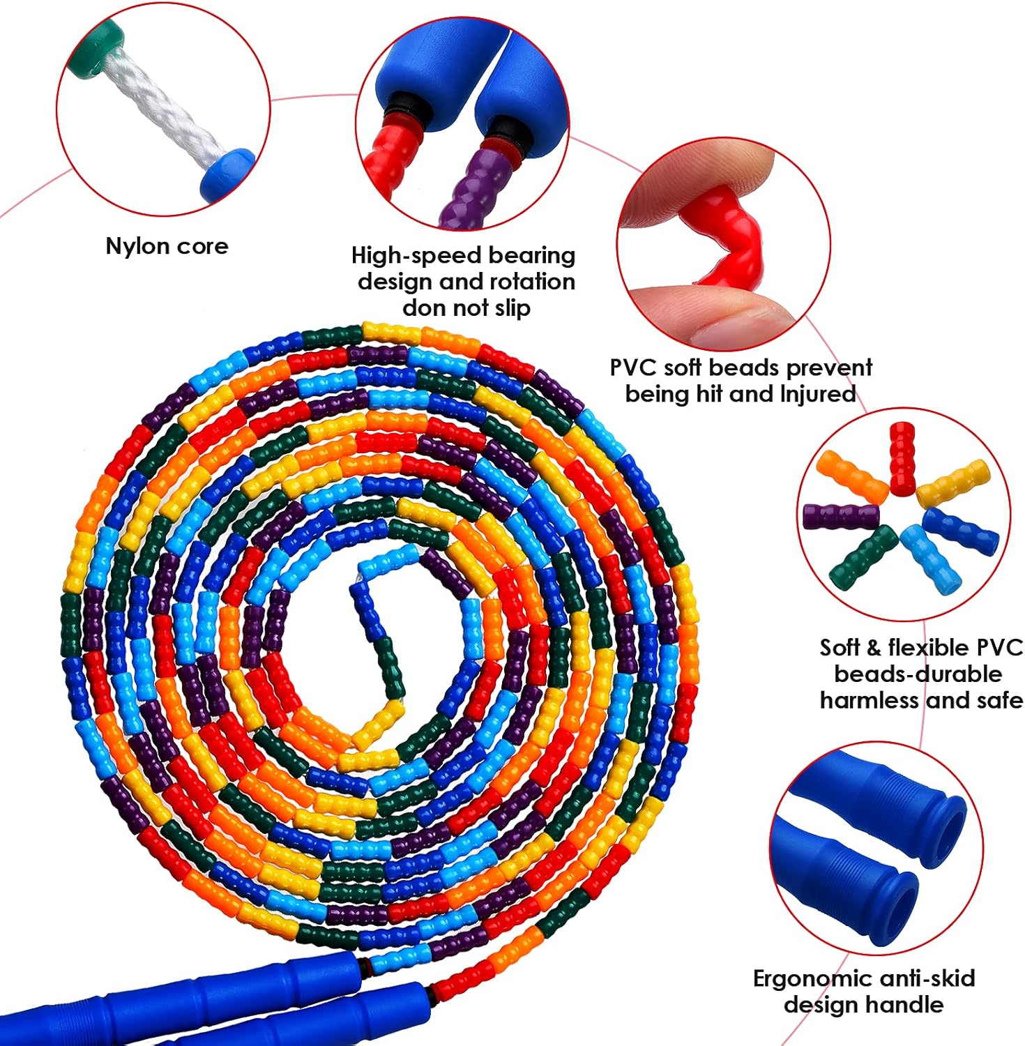 【Excellent Material】💖The soft colored PVC beads are shatter-resistant and wear-resistant;thick PP handle more resistant to fall; rope core using high-density nylon rope, with excellent wear resistance.